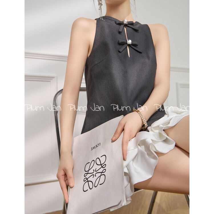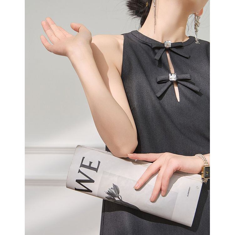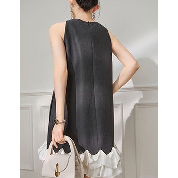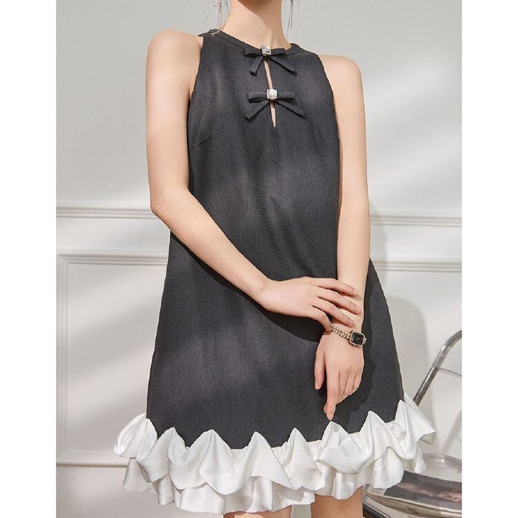 ダブルリボン Aライン ラッフルヘム ノースリーブ ワンピース 25158