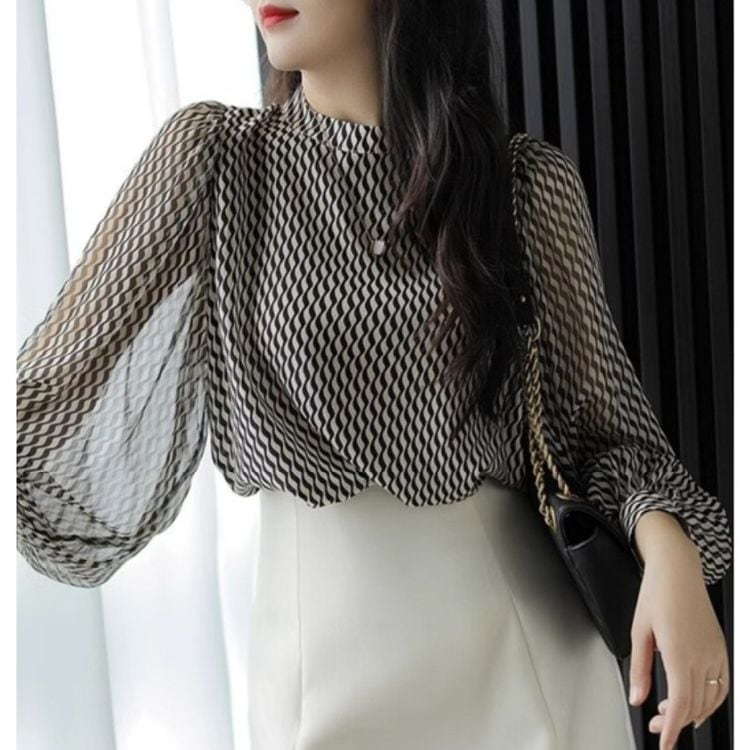 ジオメトリックパターン スタンドカラー シフォンブラウス 25189