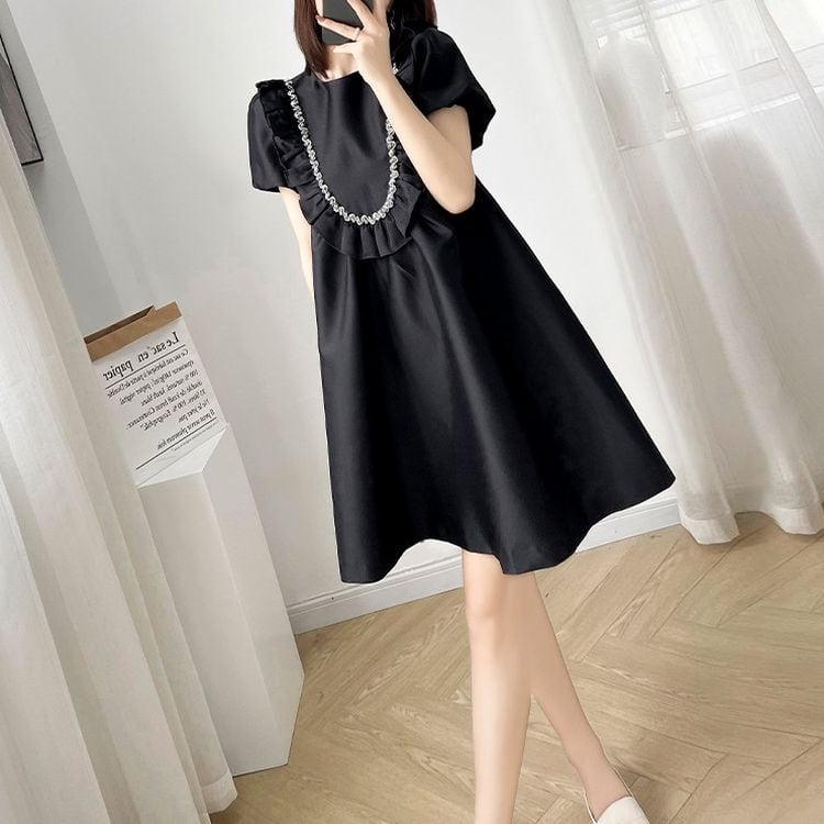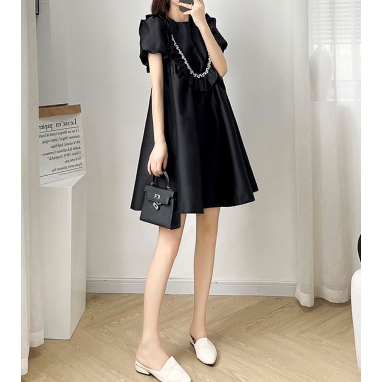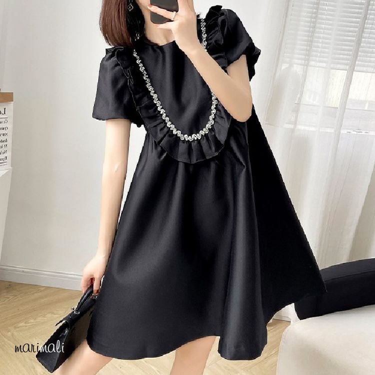 #黒ドレス #セルフィー #フリルデコレーション #パフスリーブ #ミニドレス