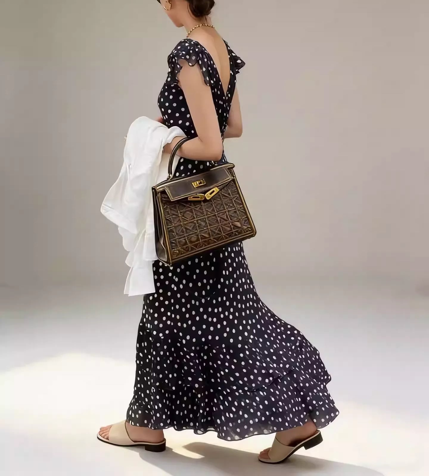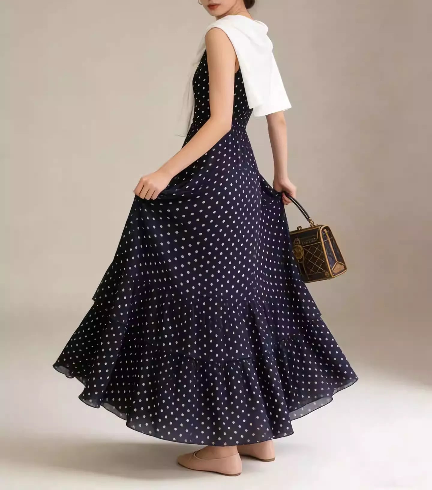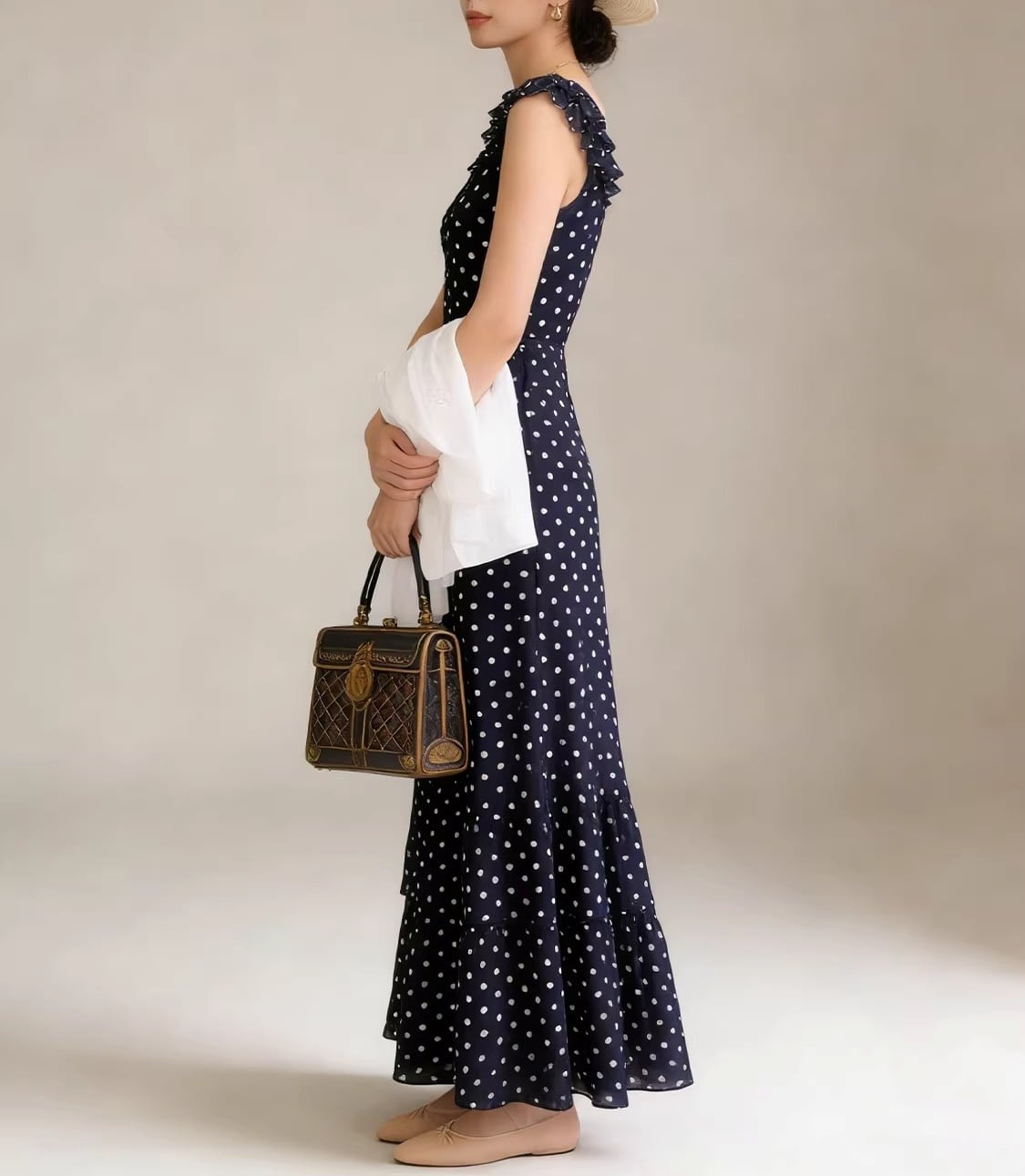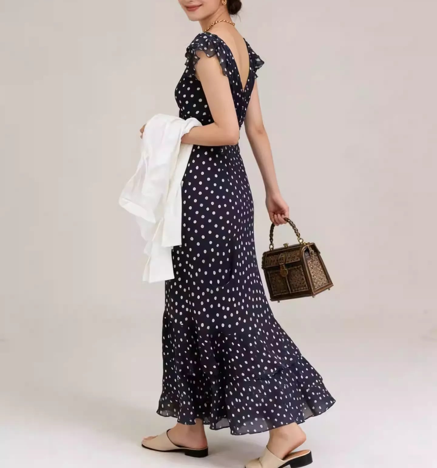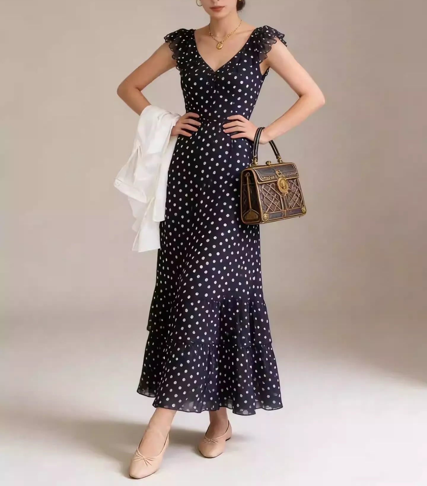 上品なドット柄にVネック&フリルデザインが魅力のワンピース