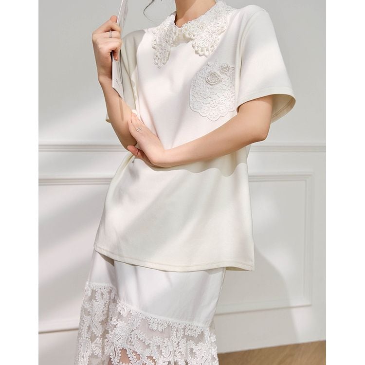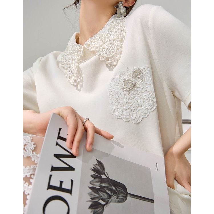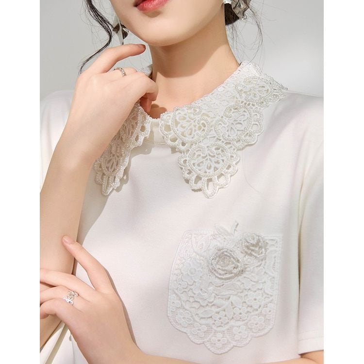 レース襟と胸元のレースアップリケが魅力的なブラウスです。