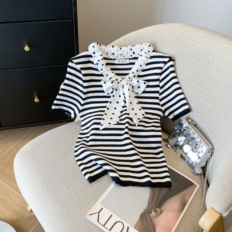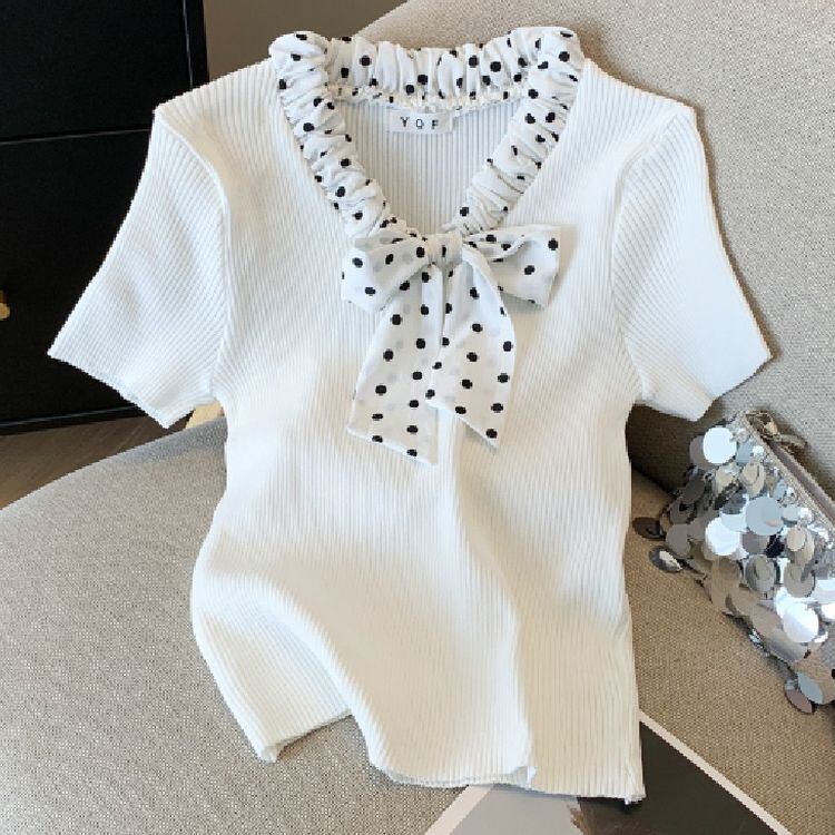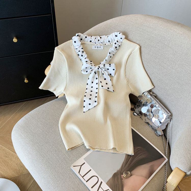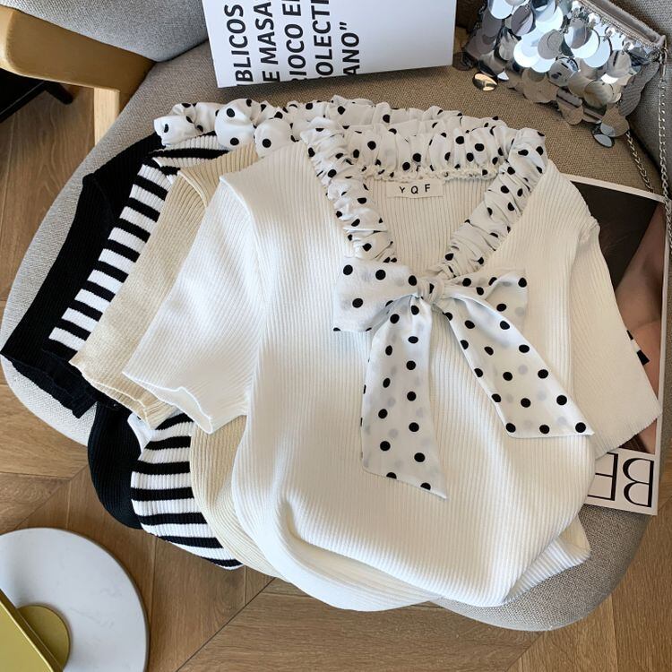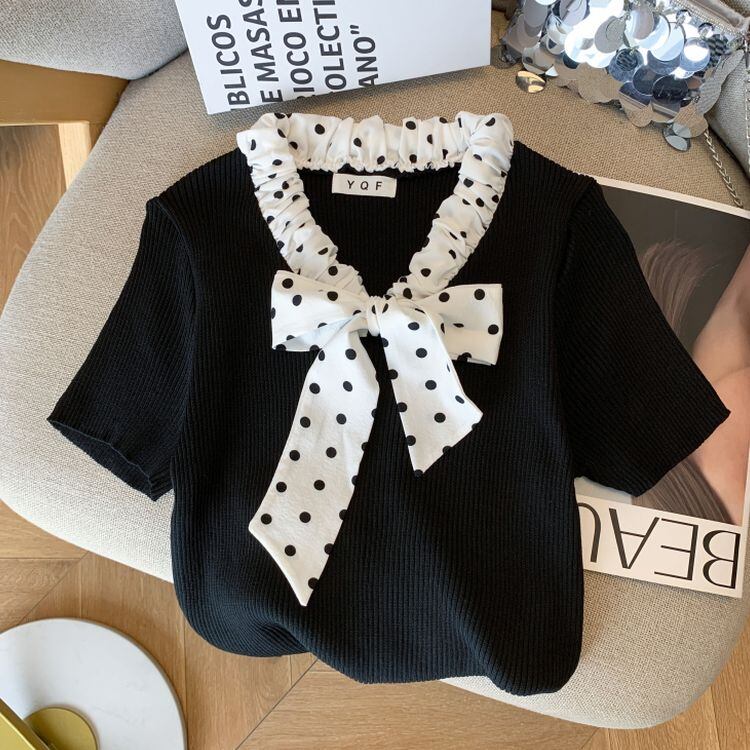 #ポロシャツ #ドット柄 #ファッション #ニットトップス #ボウタイ