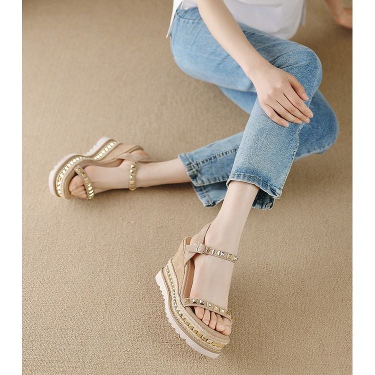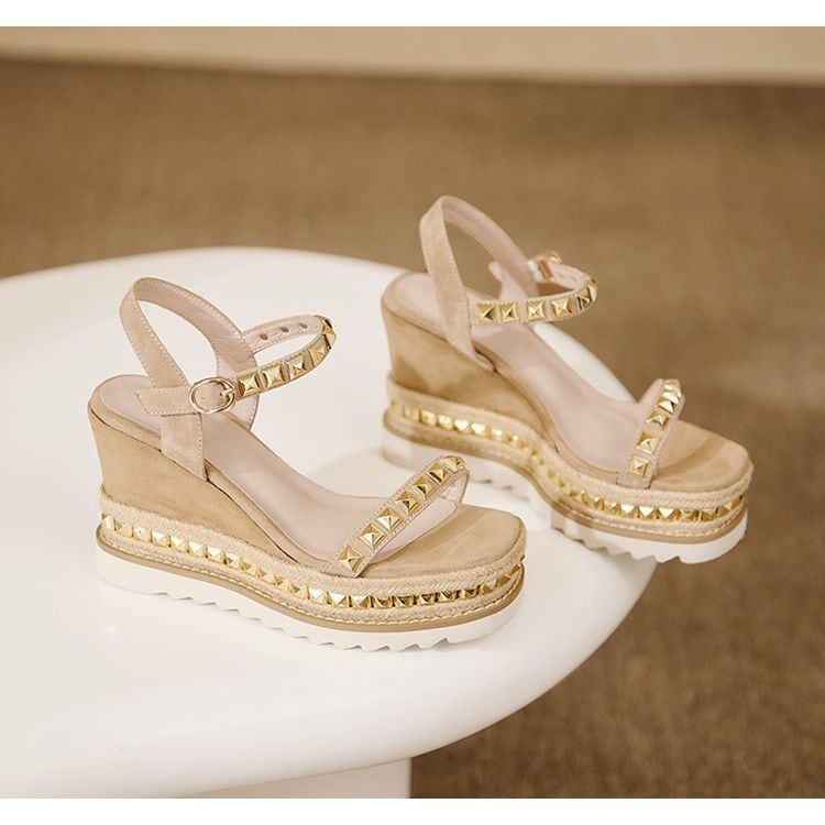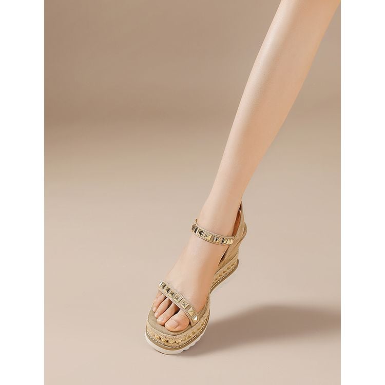 アンクルストラップとスタッズがポイントの、おしゃれなウエッジソールサンダル。