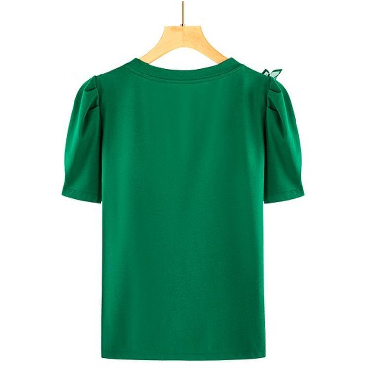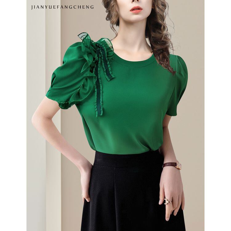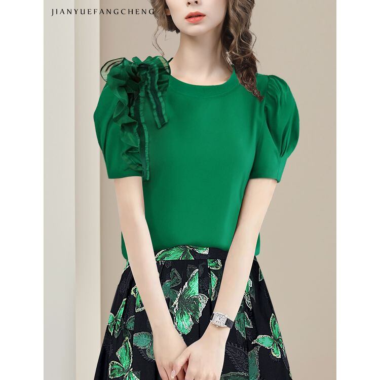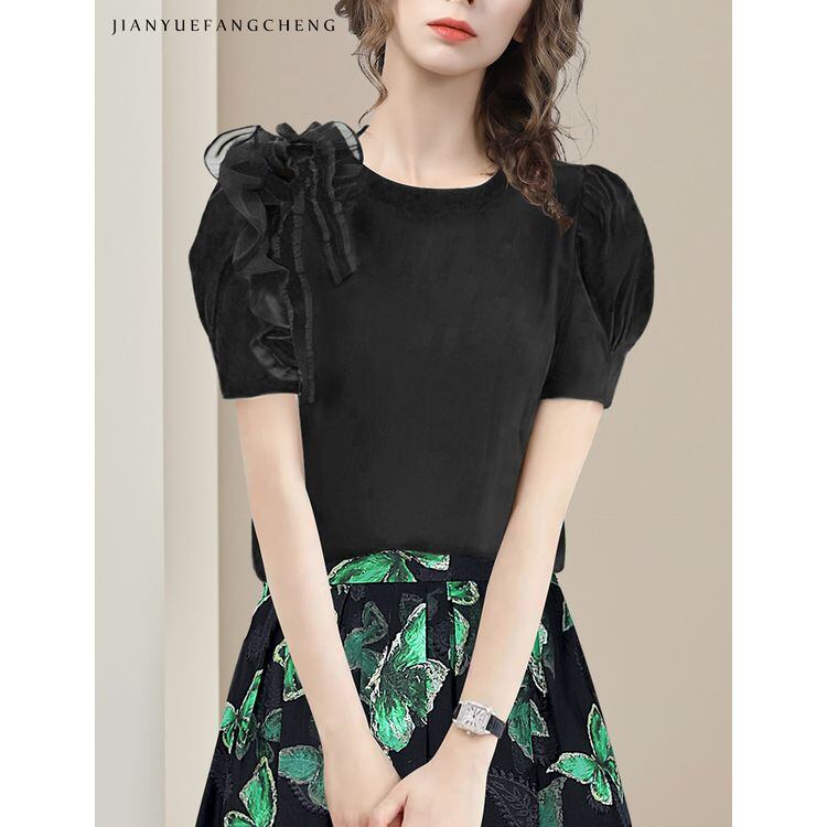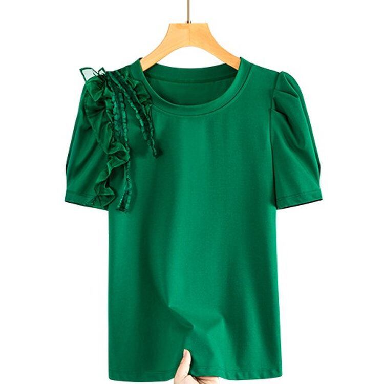 パフスリーブ ショルダーフリル ラウンドネック トップス 2color 25380