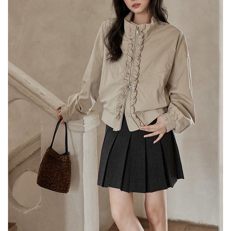 いつものコーディネートにかわいさをプラスする、フリルジップアップブルゾン。