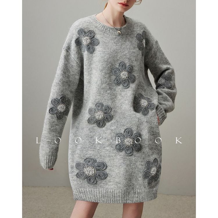 花柄を大胆にあしらった、存在感のあるニットワンピース。