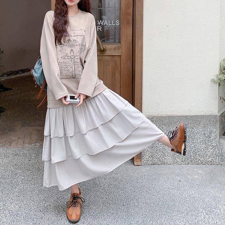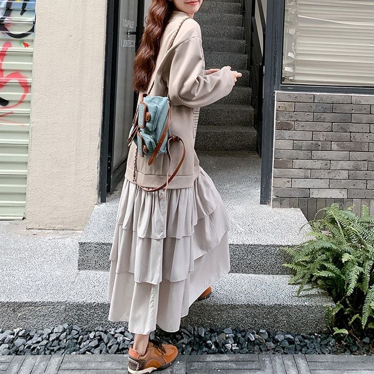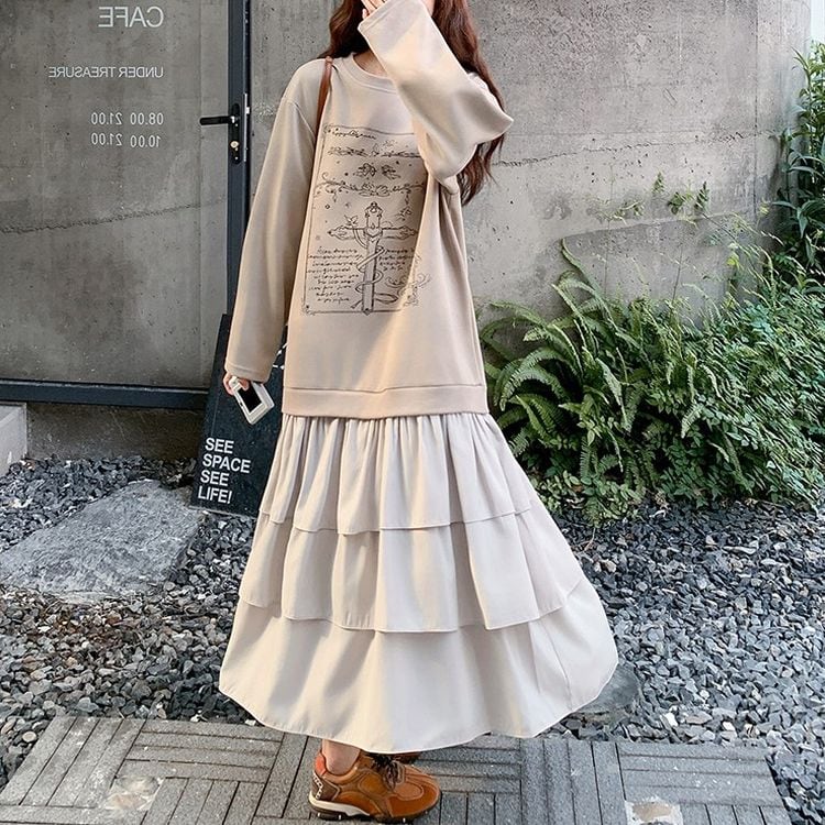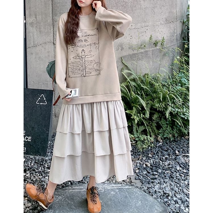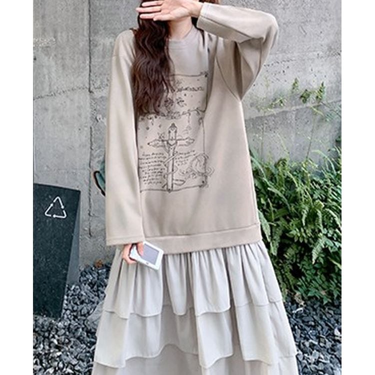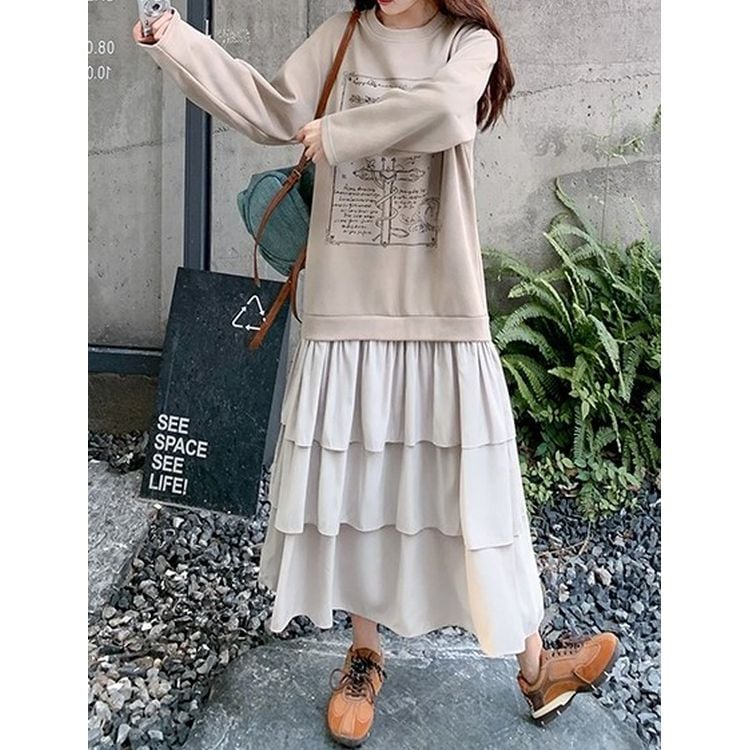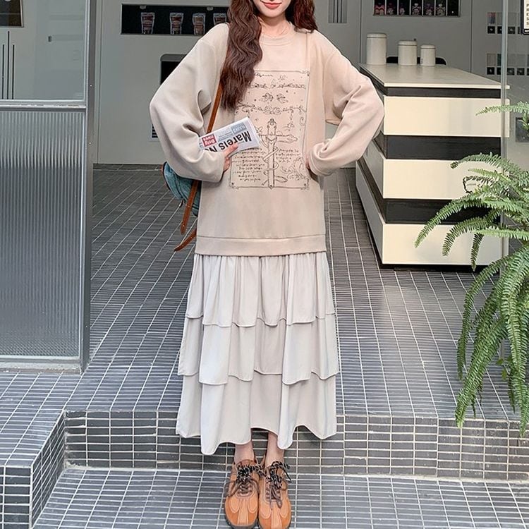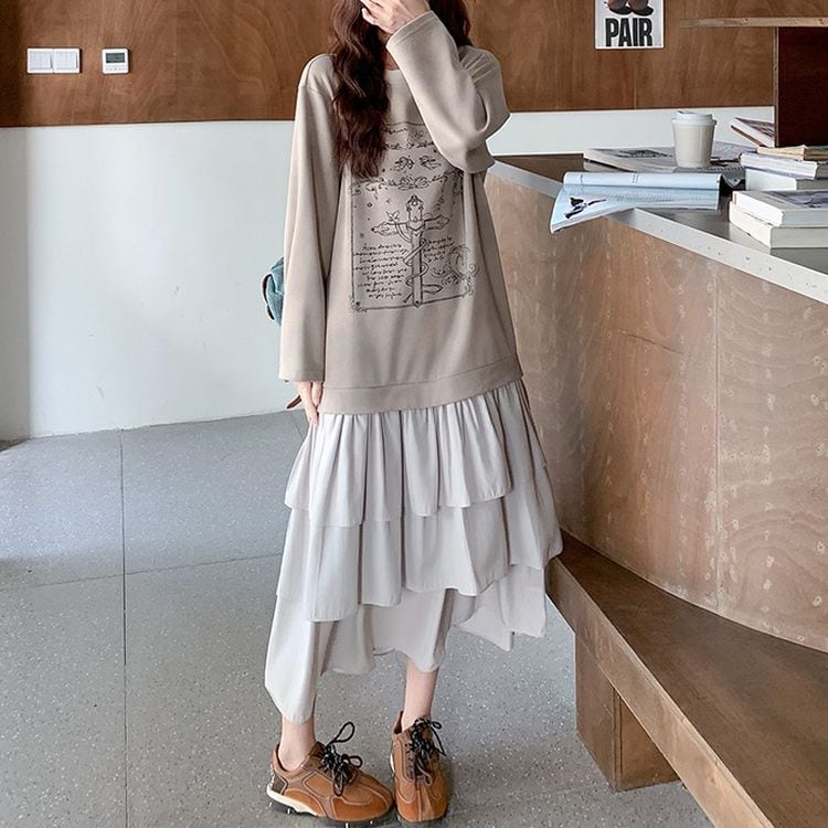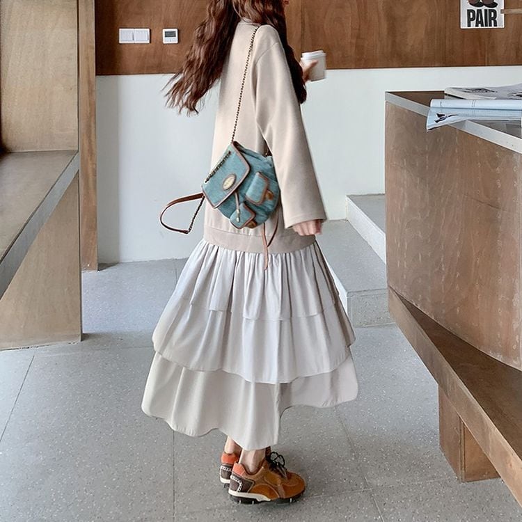 カジュアルなスウェット素材と、華やかなティアードデザインのドッキングワンピース。