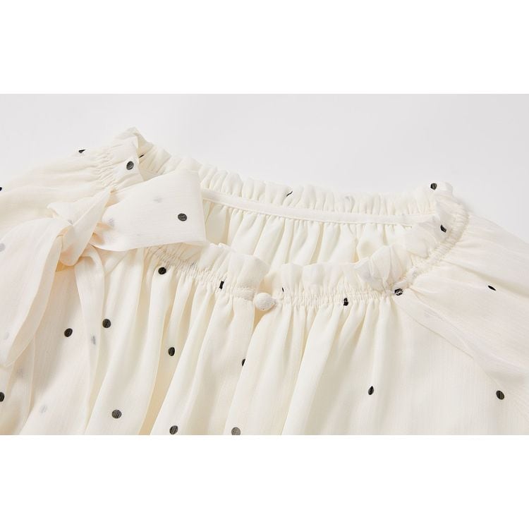 ドット柄がフェミニンな印象を与える長袖ブラウス。
