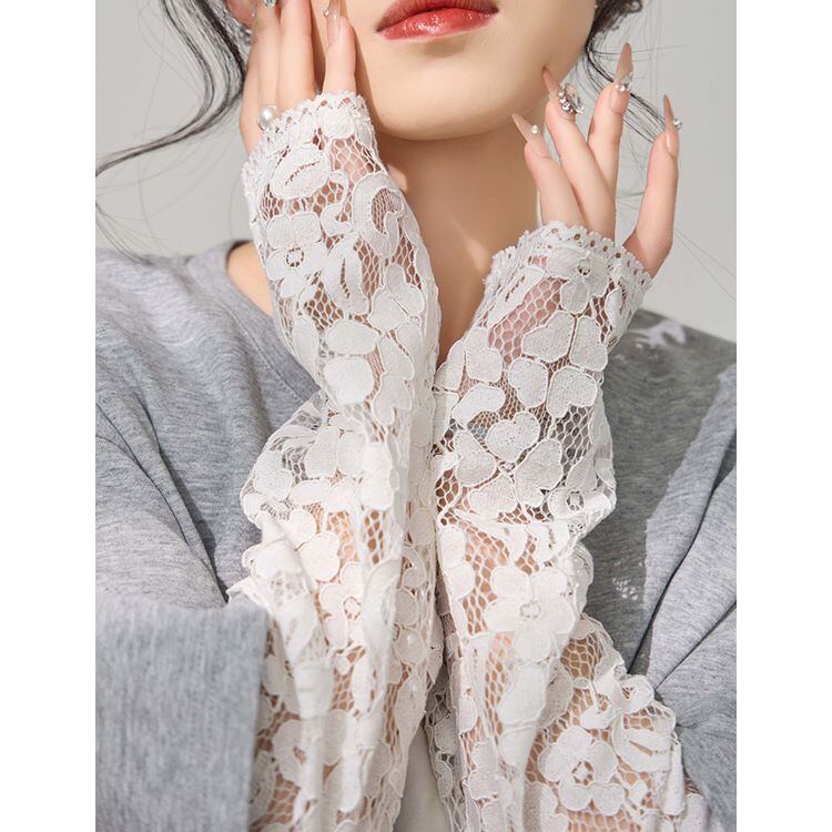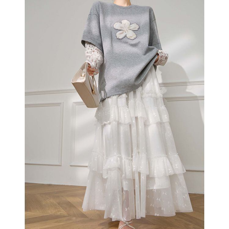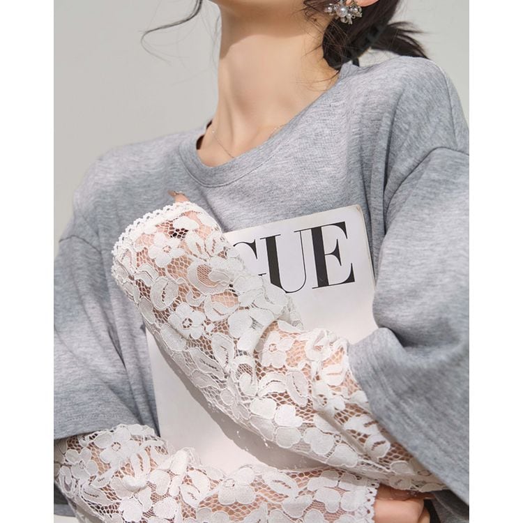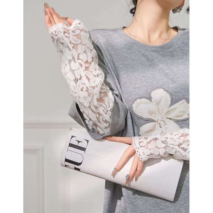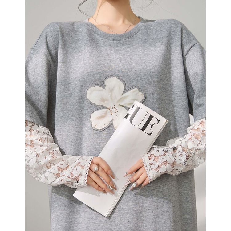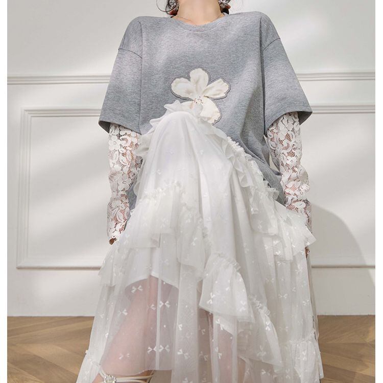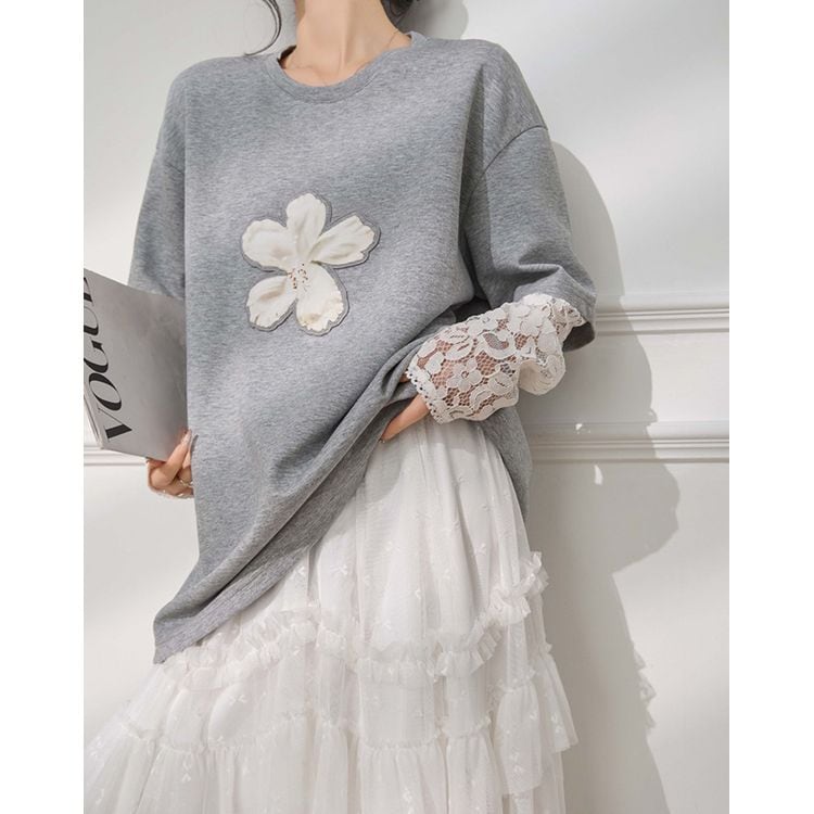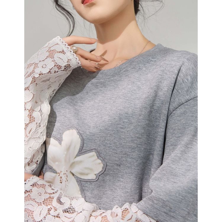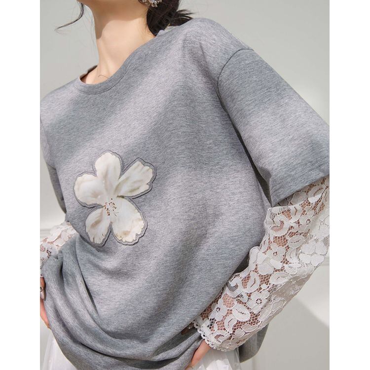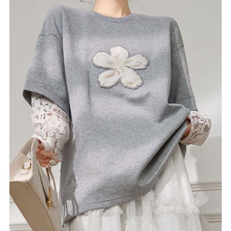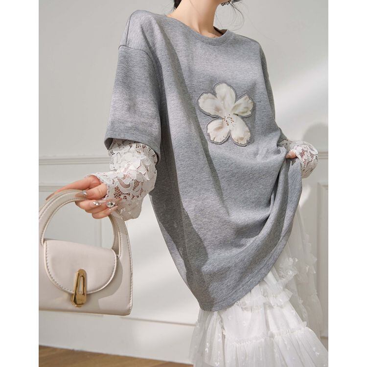 フラワーモチーフとレーススリーブが特徴のカットソー。