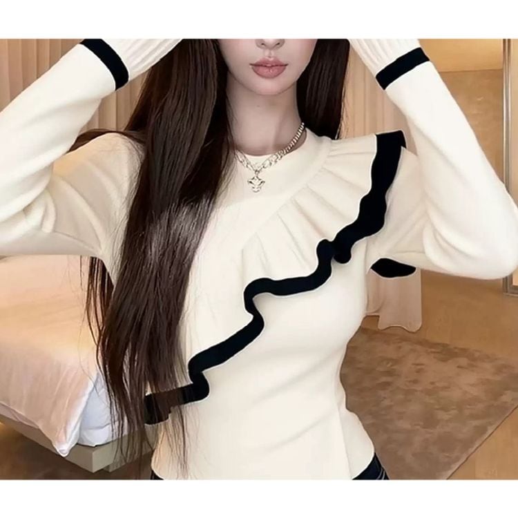 アシンメトリーなフリルデザインが大人可愛いスリムニット。