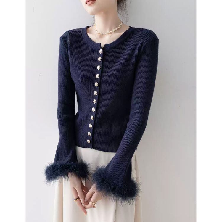 袖口にあしらわれたファーが目を引くニットカーディガン。