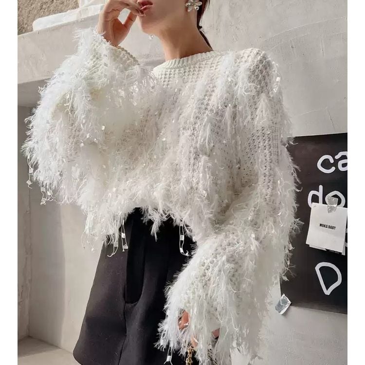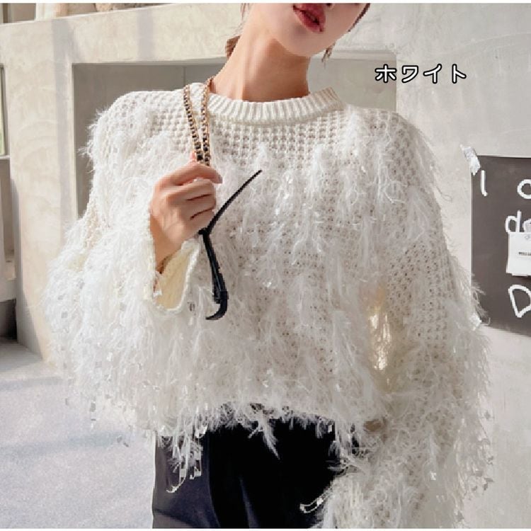 個性光るフェザーデザインがポイントのニット。