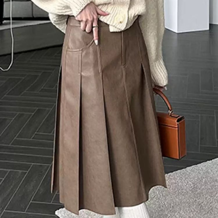 プリーツ フェイクレザー Aライン ミディ スカート 2color 25535