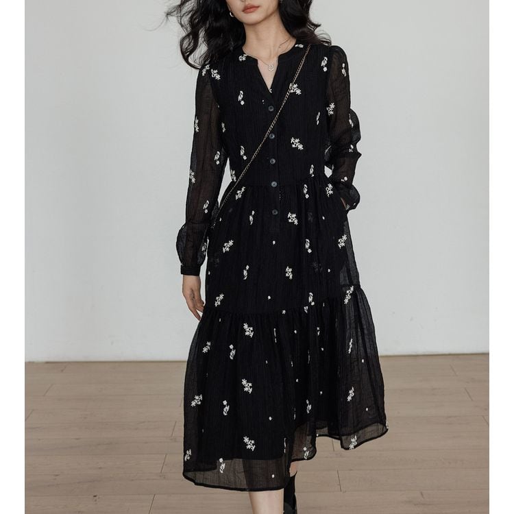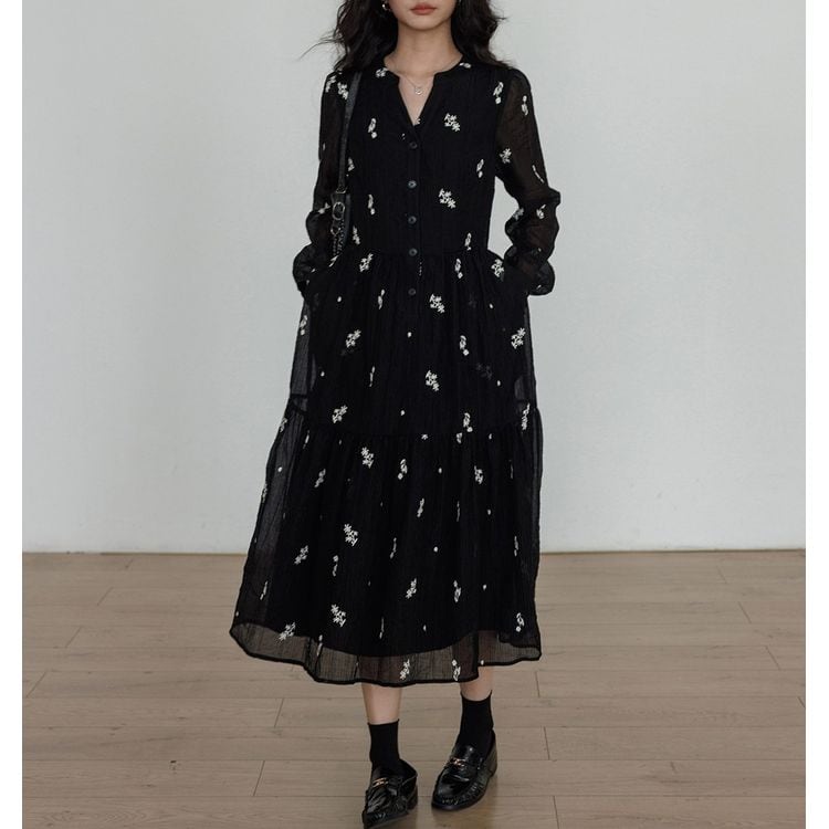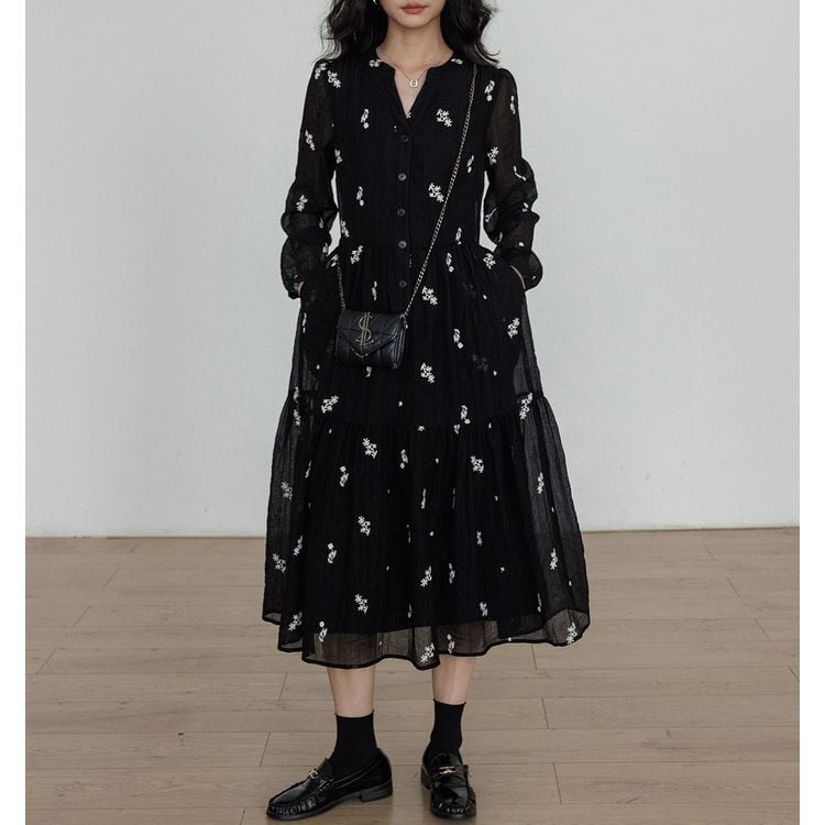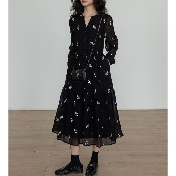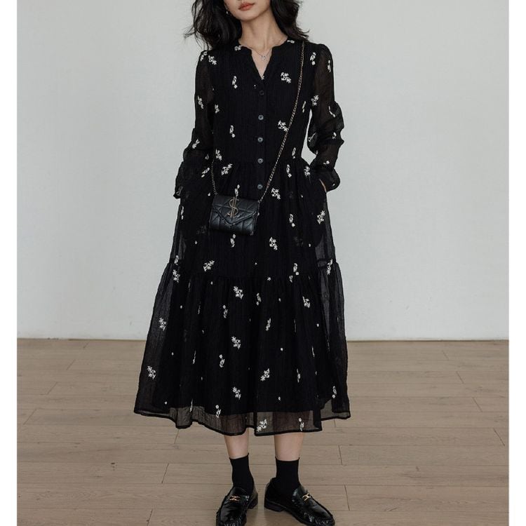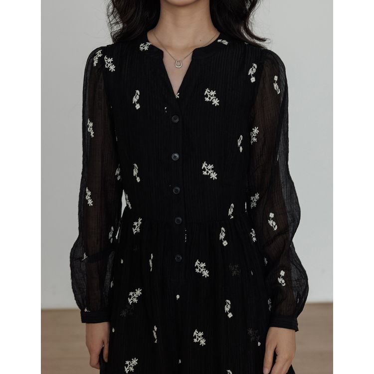 キーネック プランツ刺繍 シフォン ワンピース 26012