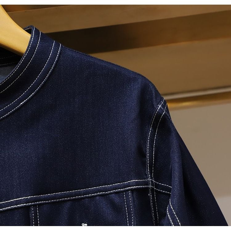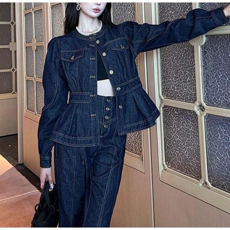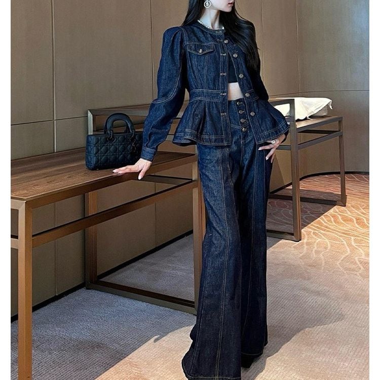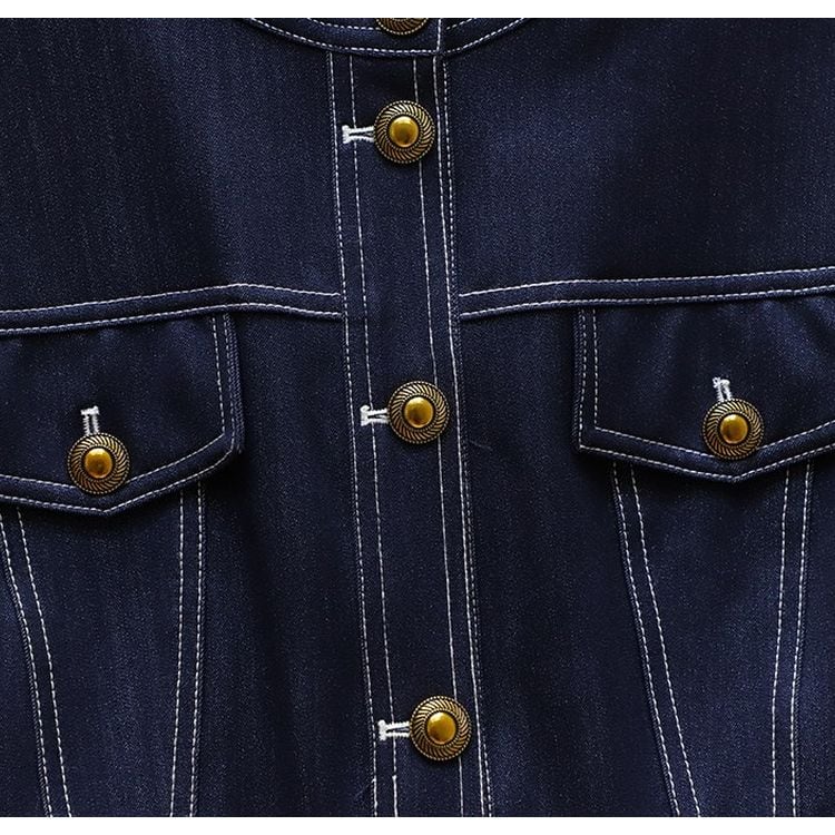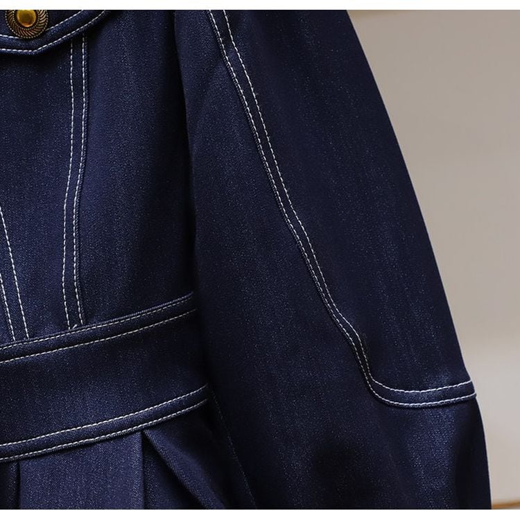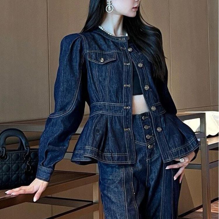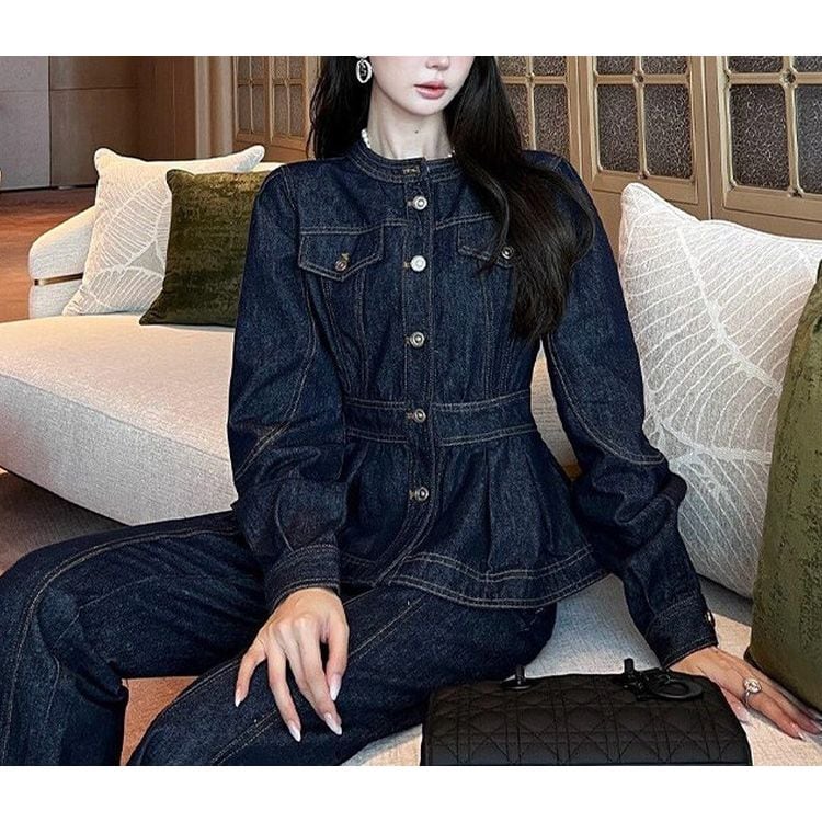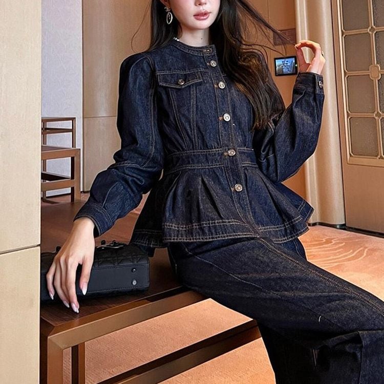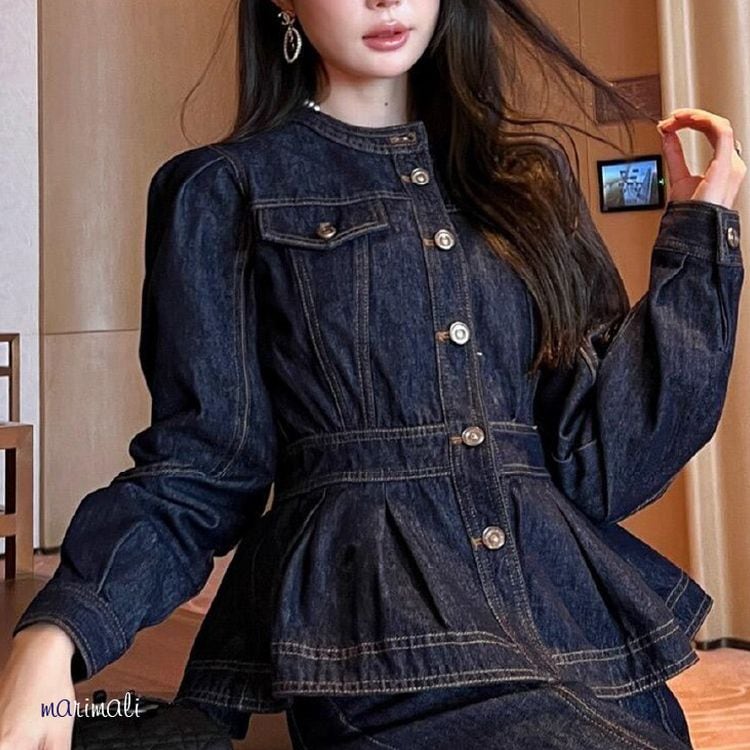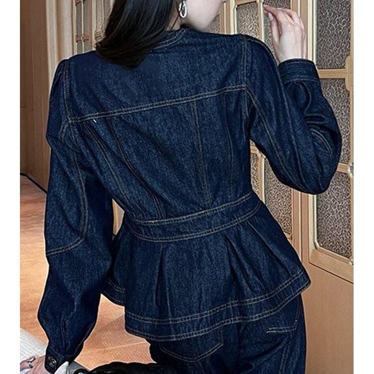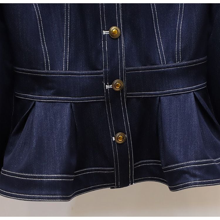 ペプラムデザインがアクセントのヒップ丈デニム調ジャケット。