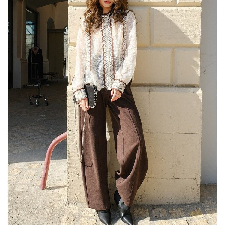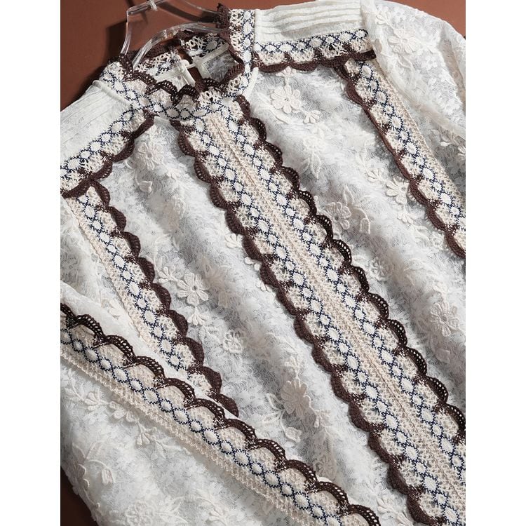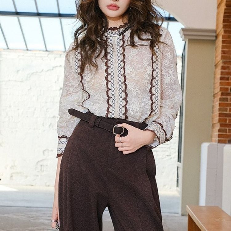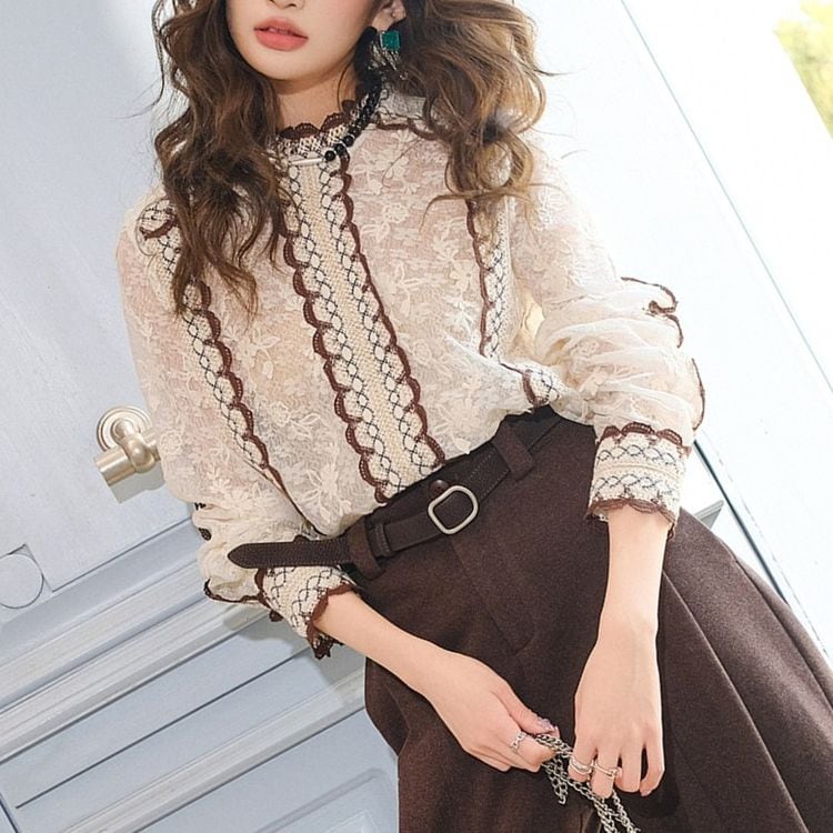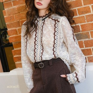 レースデザインがフェミニンな長袖ブラウス。