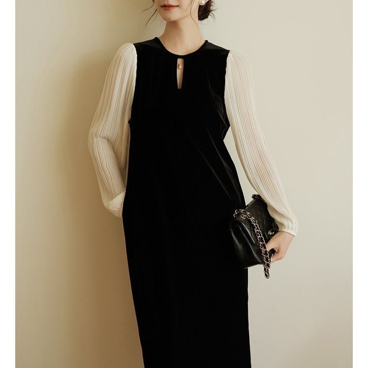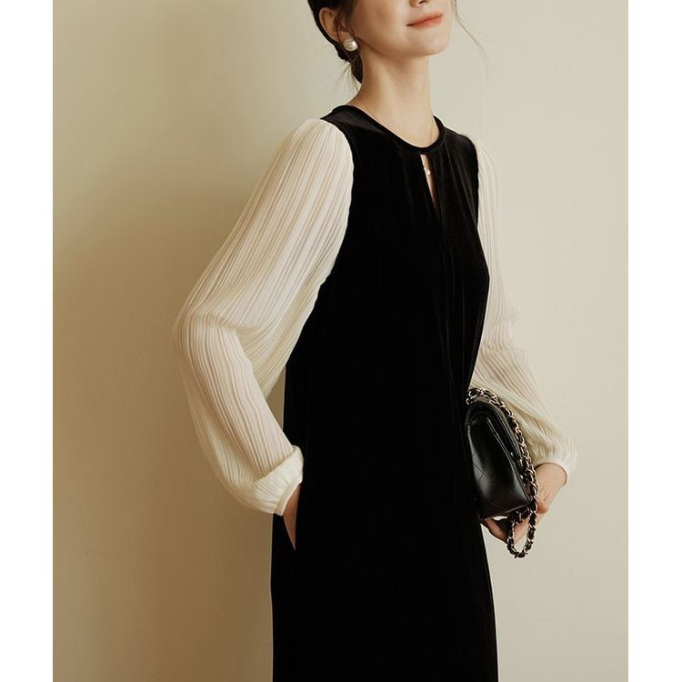 エレガントなベロア素材が魅力のシフォンスリーブワンピース。