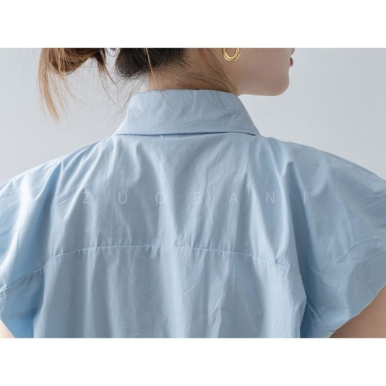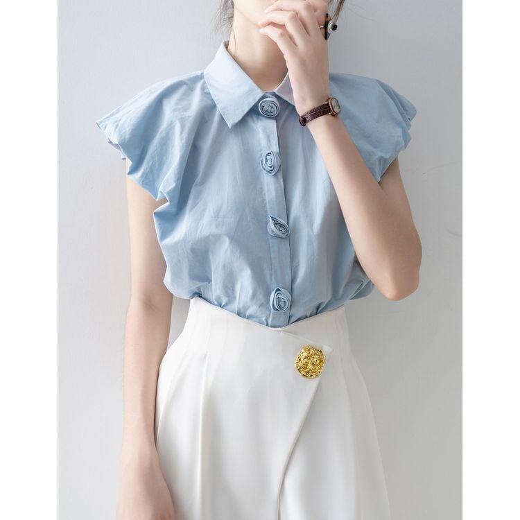 ボタンデザインが目を引く半袖シャツブラウス。