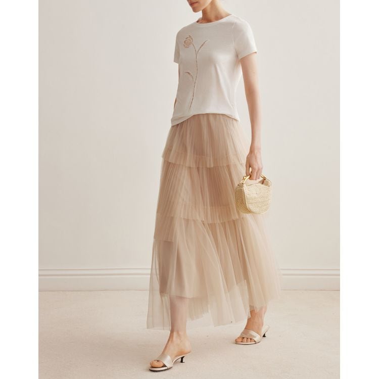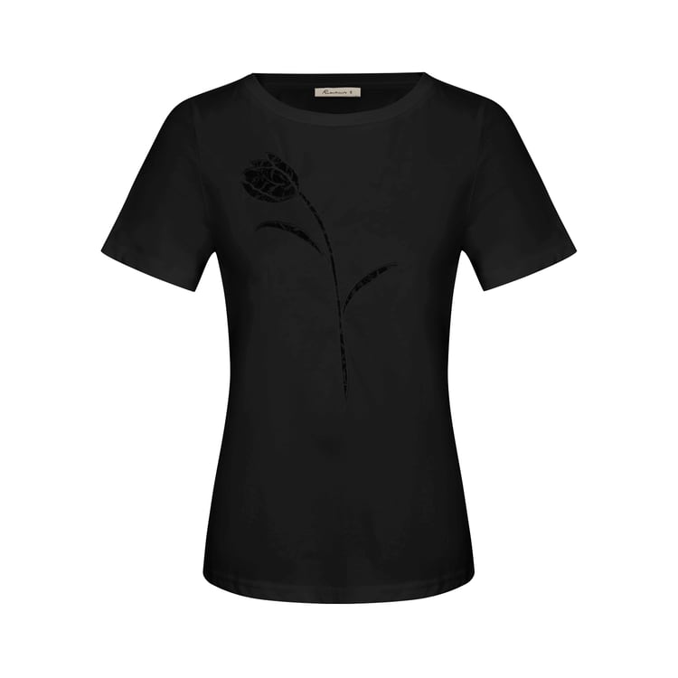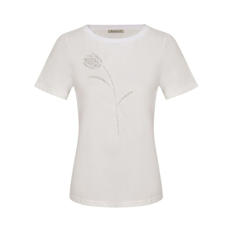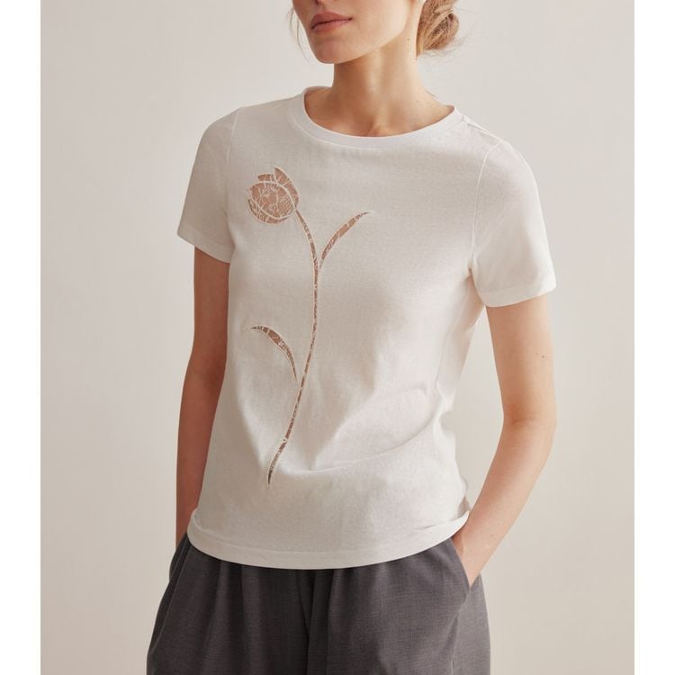 カットワークの花柄がフェミニンな半袖Tシャツ。