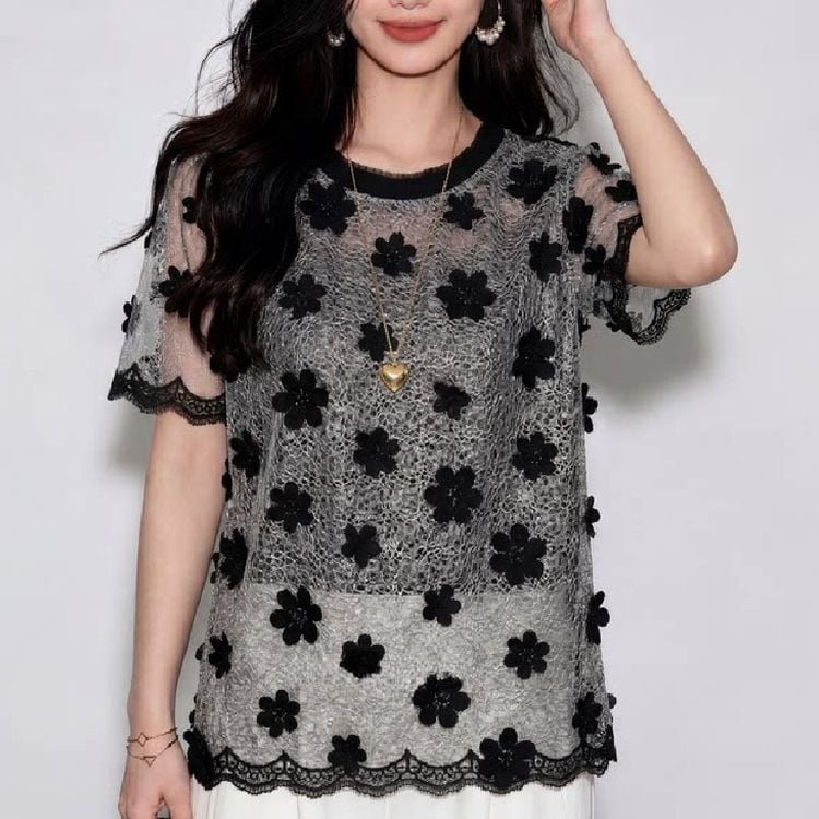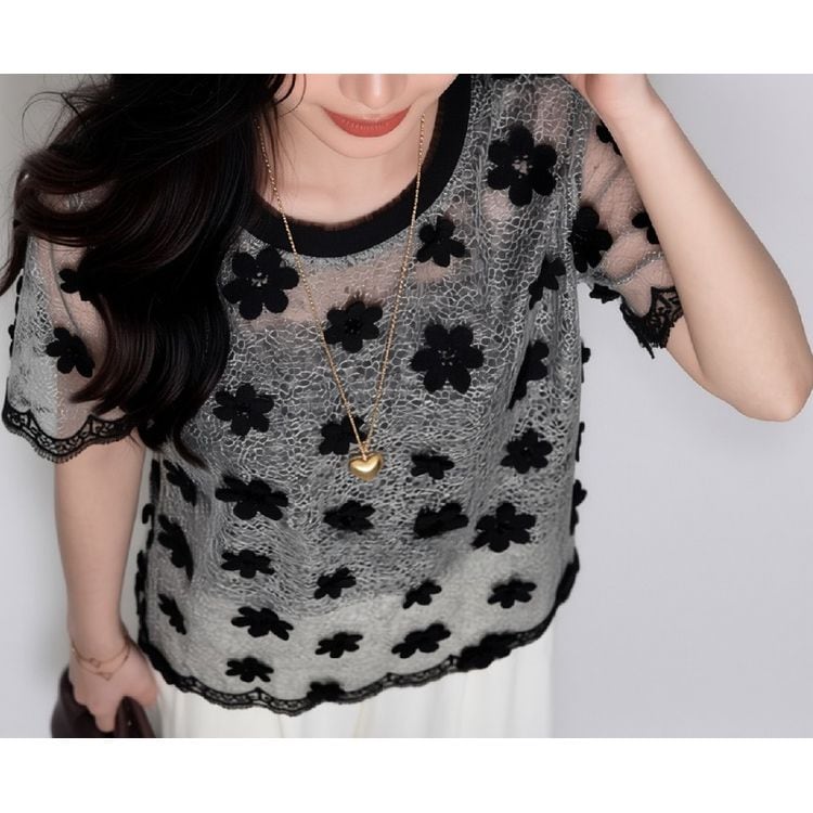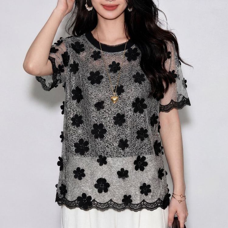 上品な透け感が魅力の花柄レース半袖トップス。