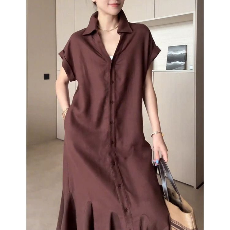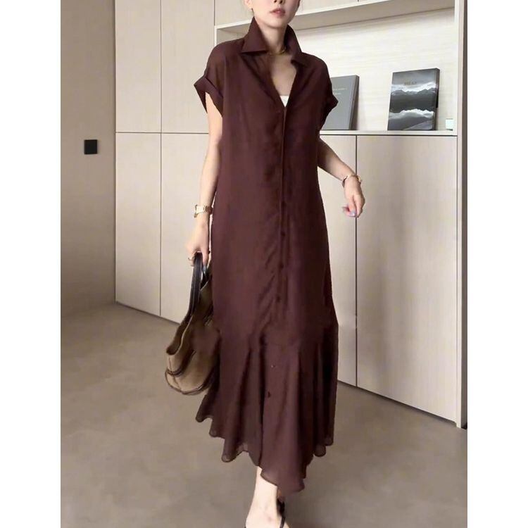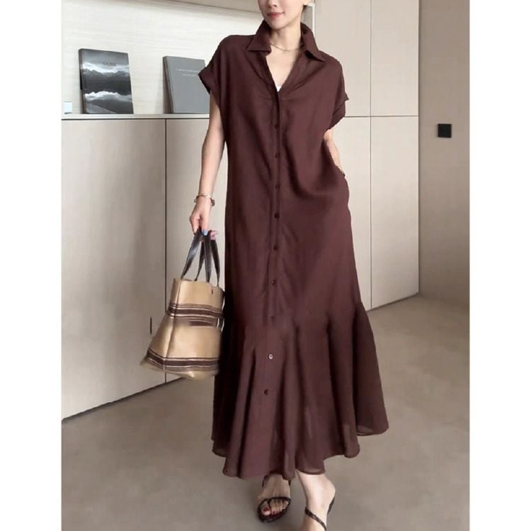 縦のラインを綺麗に見せてくれるシャツワンピース。