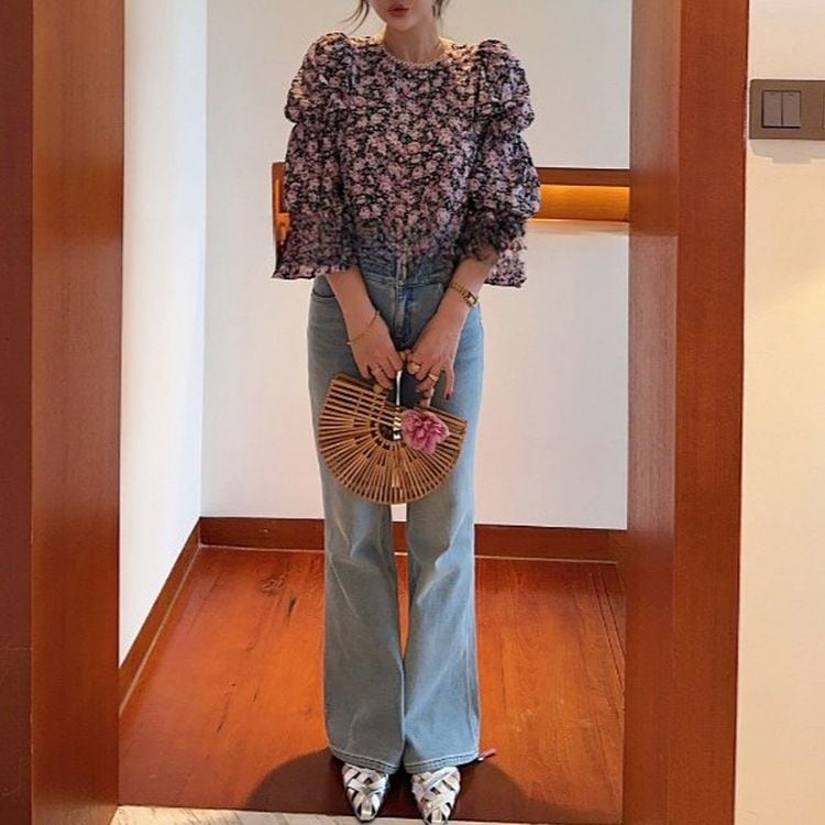 袖のふんわりとしたシルエットが、女性らしさを引き立てます。