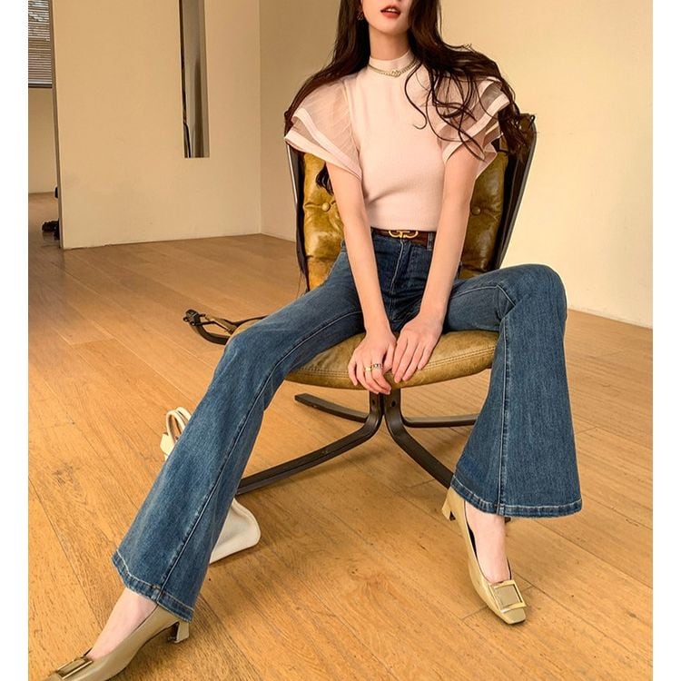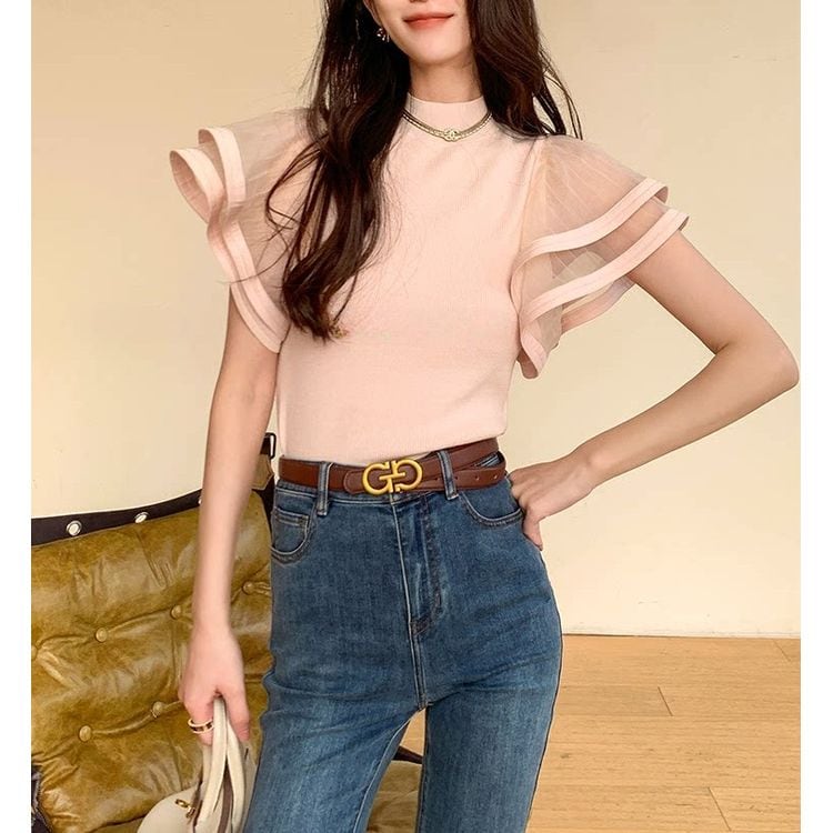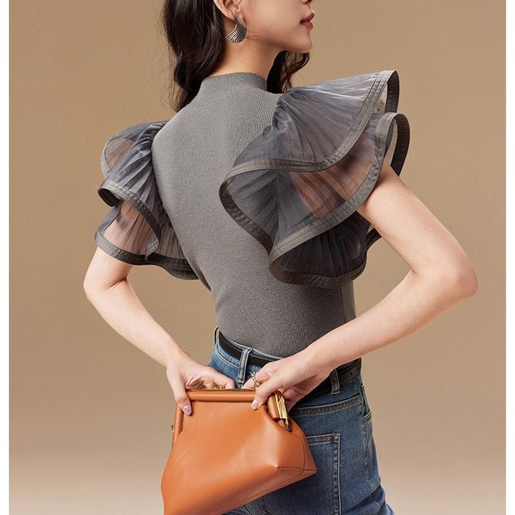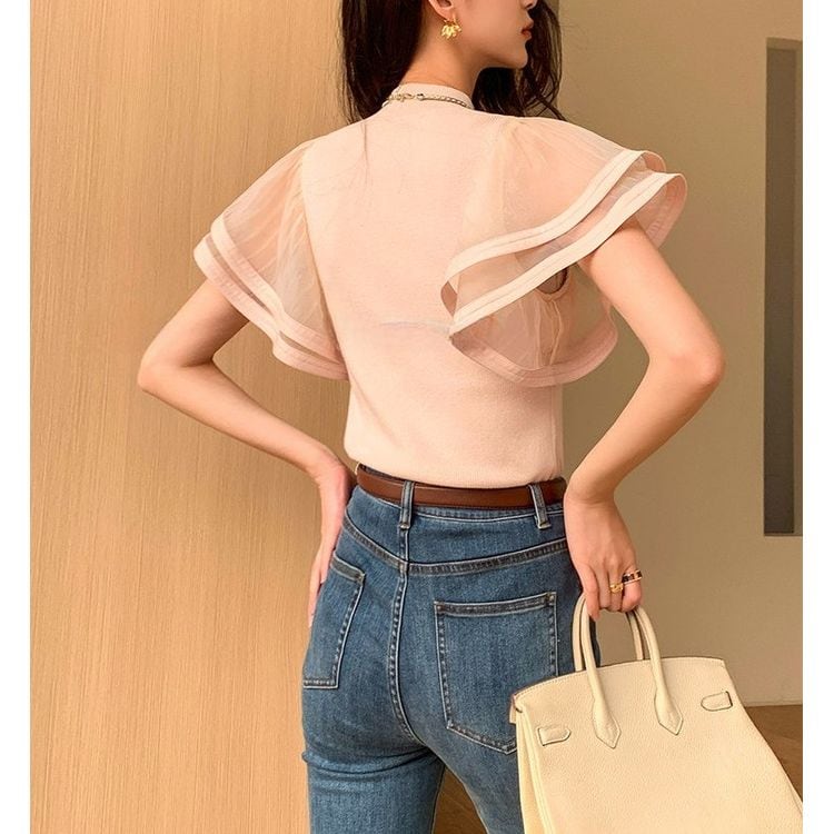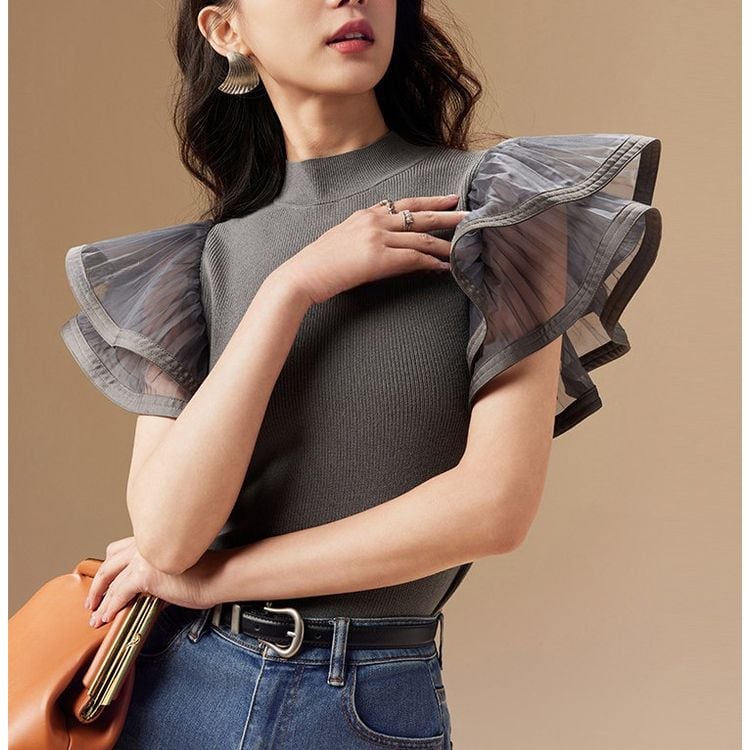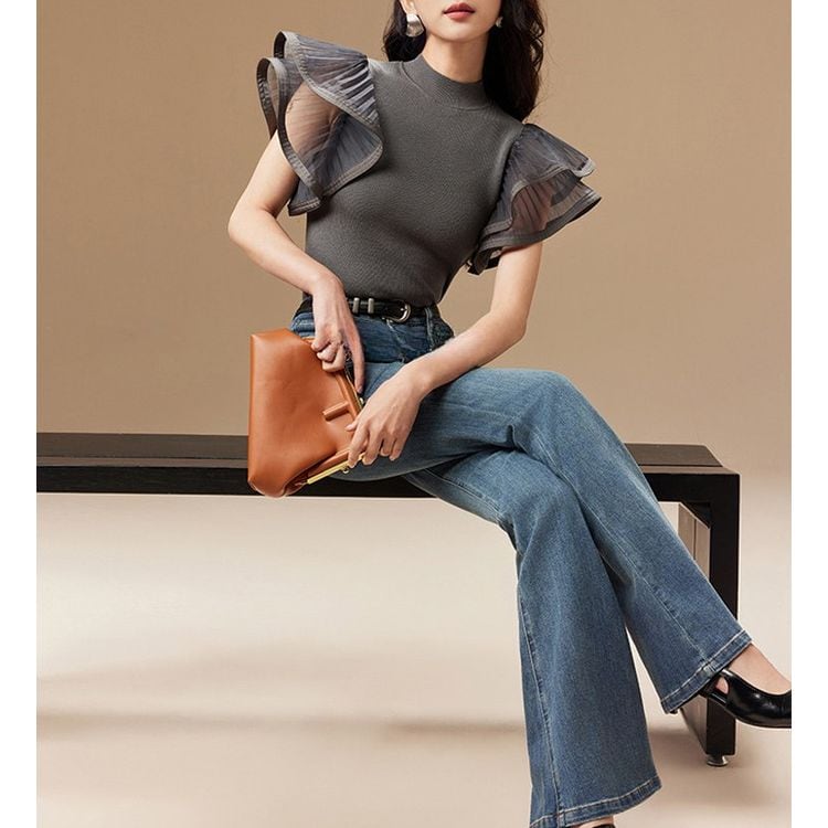 袖には透け感のあるフレアデザインを施し、フェミニンなアクセントをプラス。