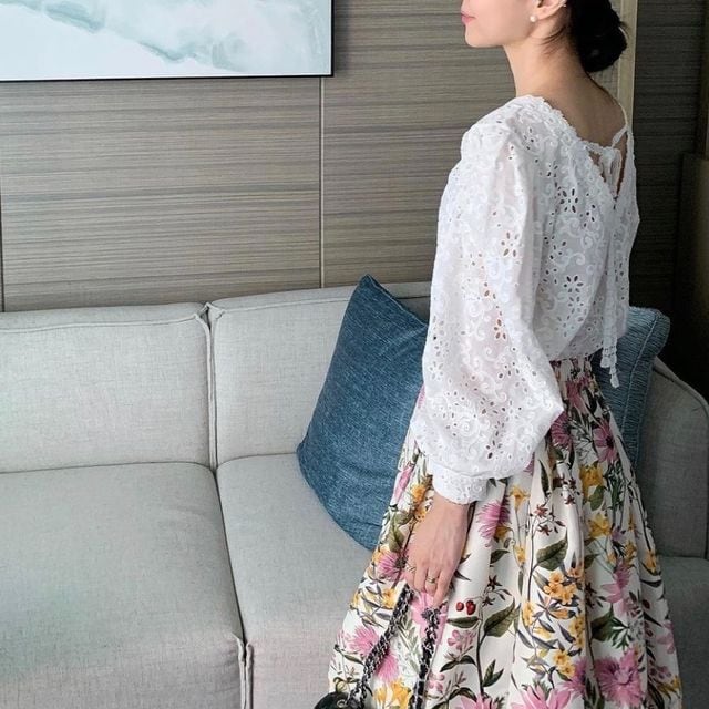 ウエストまわりにタックを入れてゆとりを持たせ、ふんわりとしたシルエットで大人可愛い装いに。