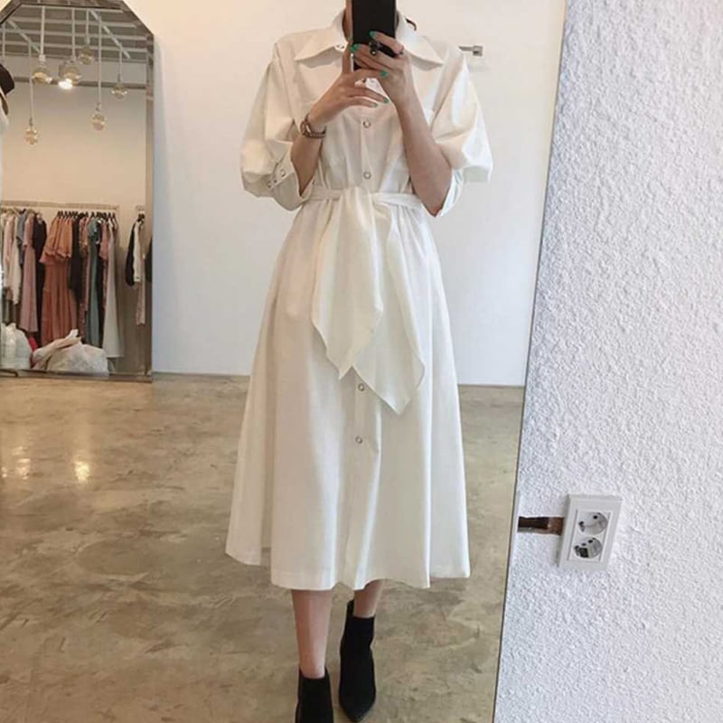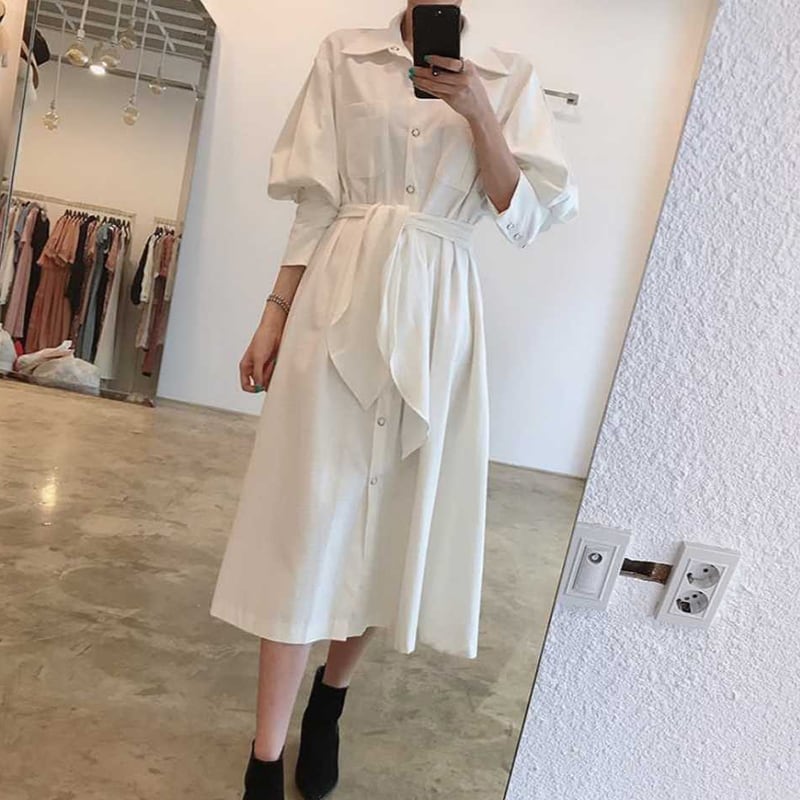 ボリューミーな袖とひらひらとしたウエストマークがポイントのシャツワンピース。