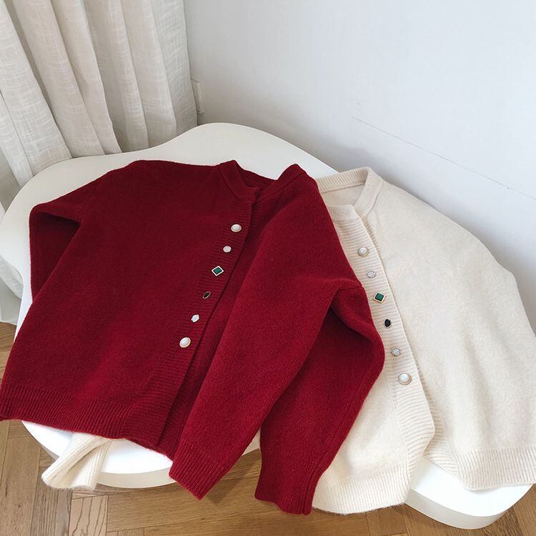重ね着もしやすいルーズなシルエットに、宝石のようなボタンがかわいいニットカーディガン♡
