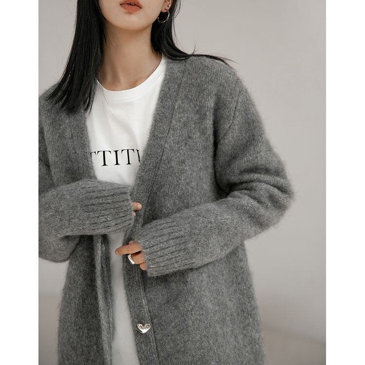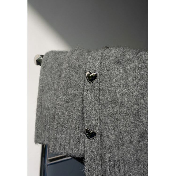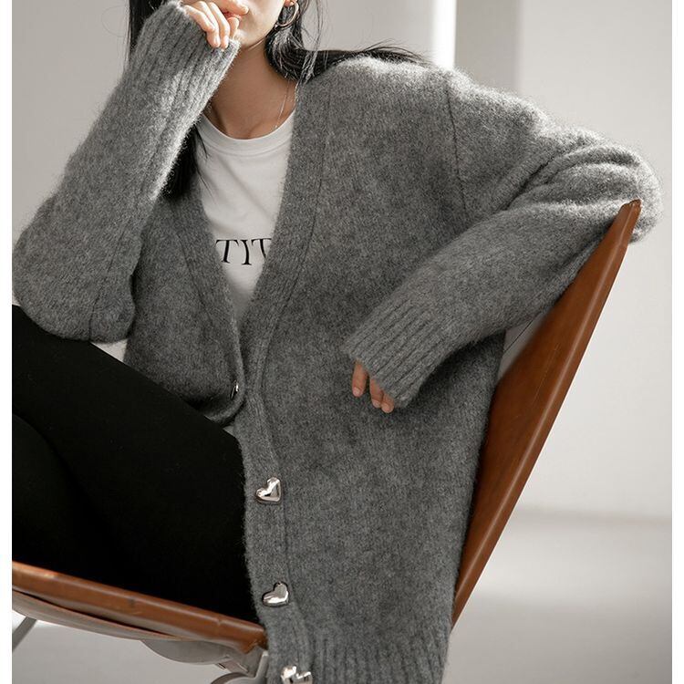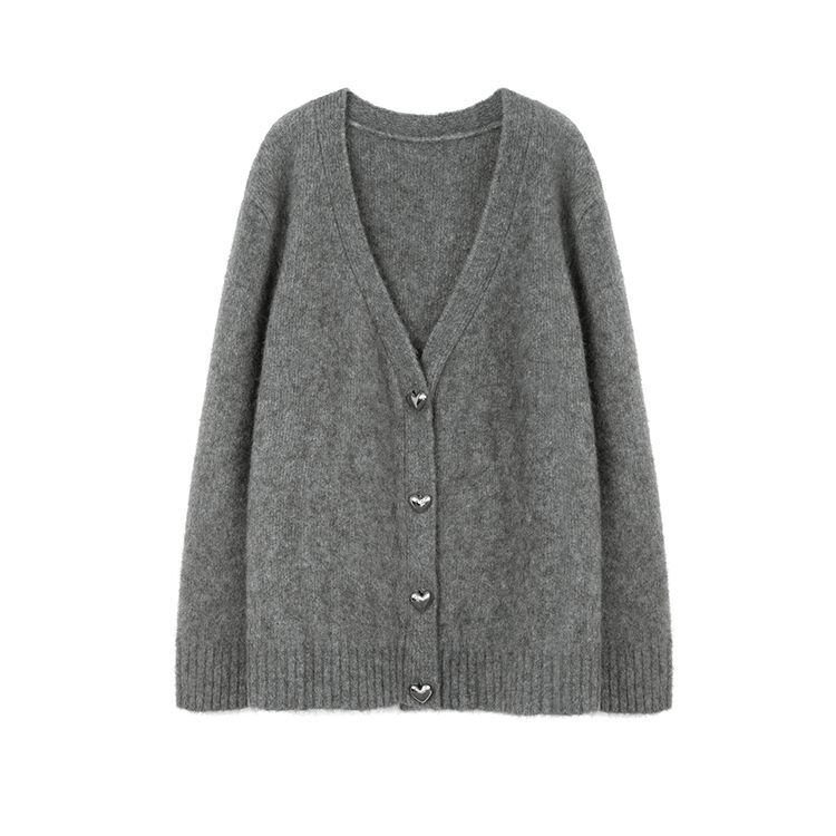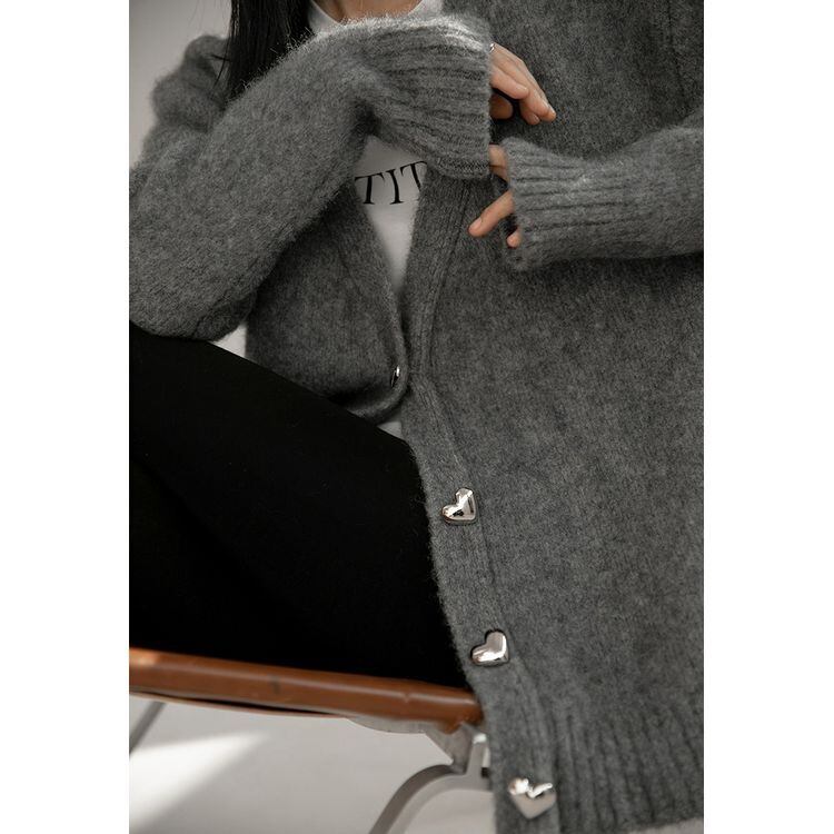 シルバーのハートボタンがポイントのデイリーに使えるニットカーディガンです。