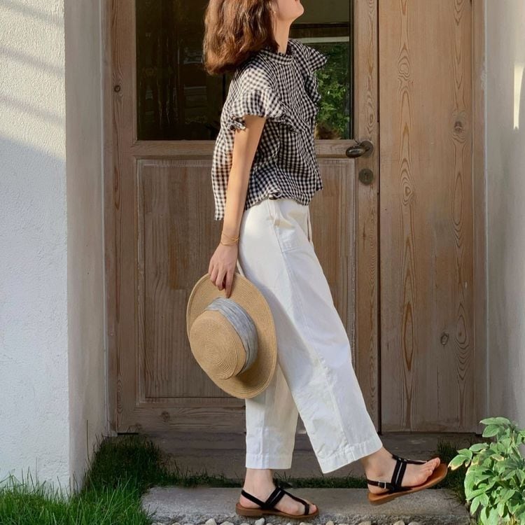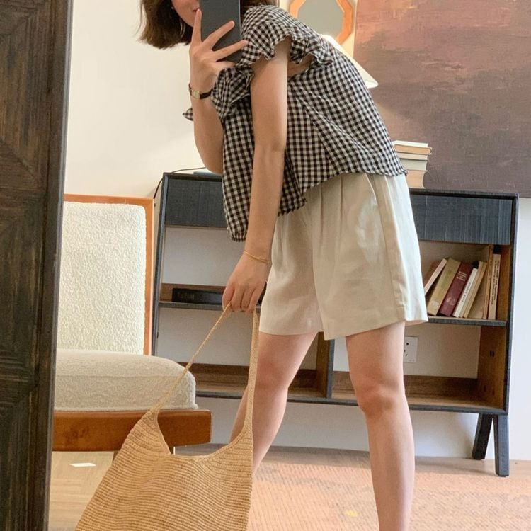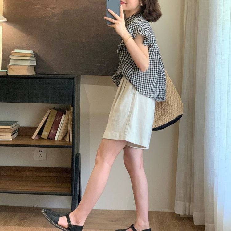 ギンガムチェックのスタンドカラーシャツ。