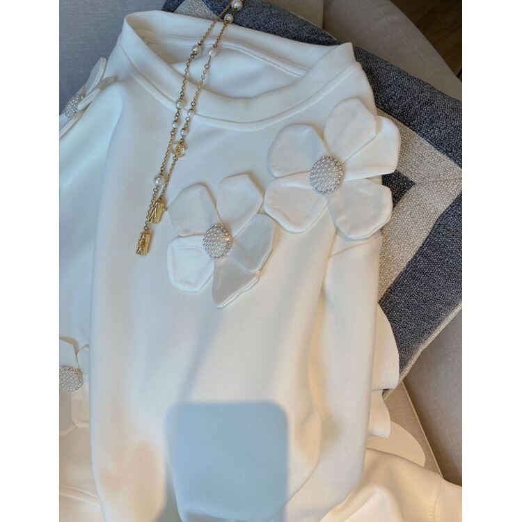パールのお花モチーフと袖のフリルがキュートなトレーナートップス。