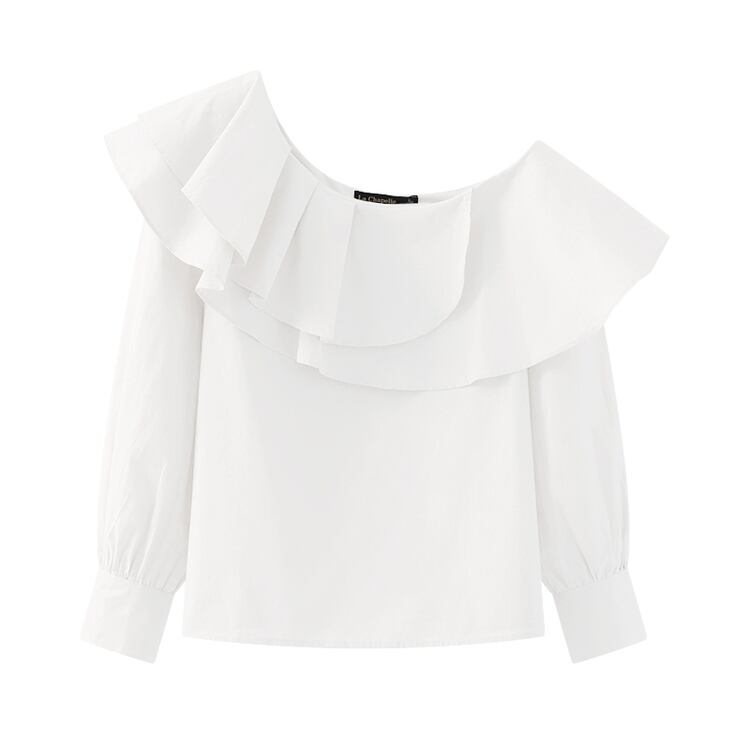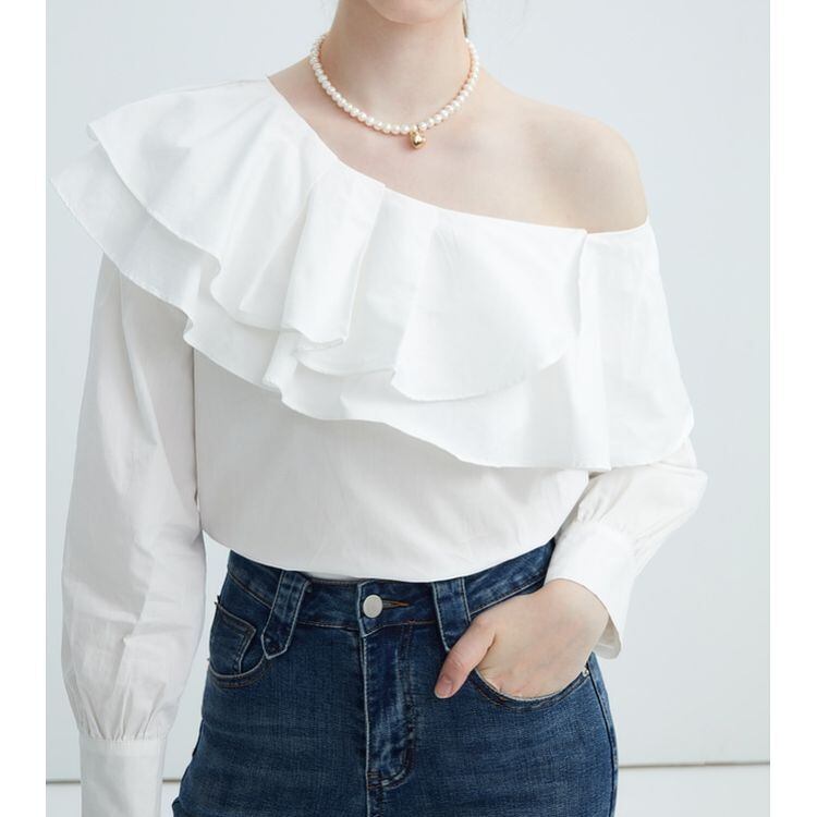 アシンメトリーな肩のデザインがかわいいシャツブラウス。