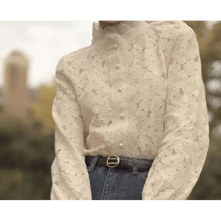 パールボタン スタンドカラー フラワー レースシャツ 24223