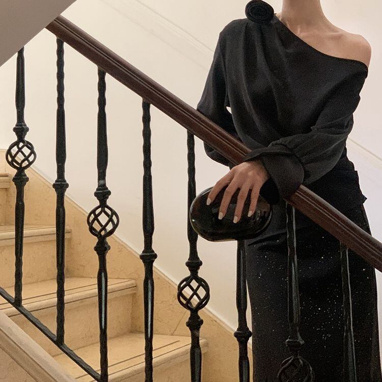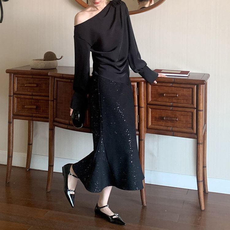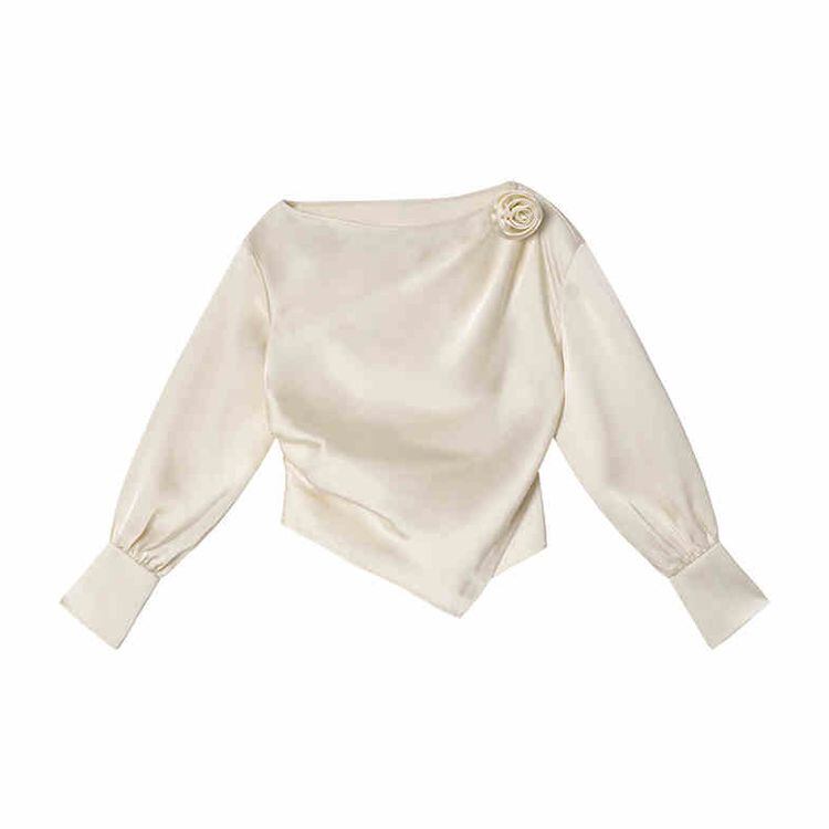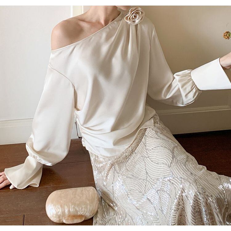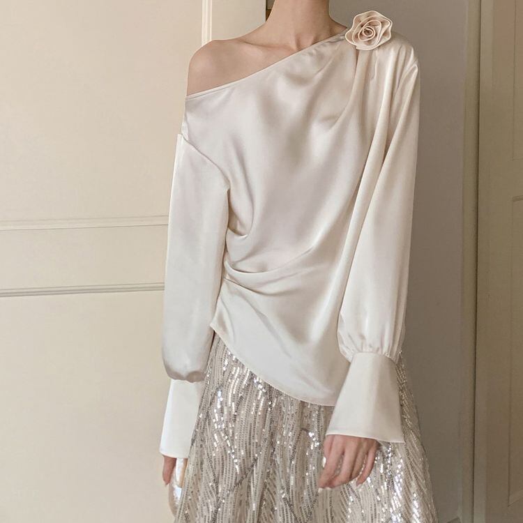 #ファッション #ホワイトシャツ #スカートスタイル #ドアウェイ #アシンメトリートップス #シアーボリューム #フラワーコサージュ #スタイルインスピレーション #女性ファッション #トレンド