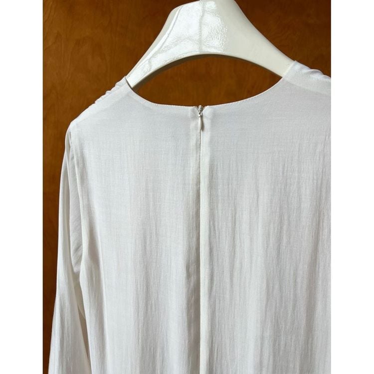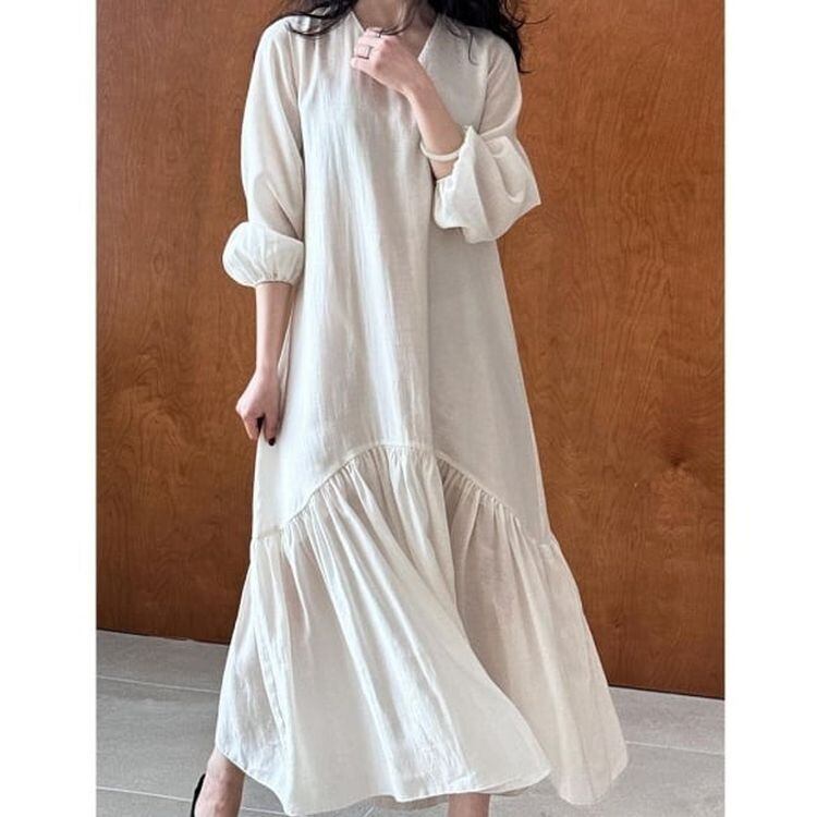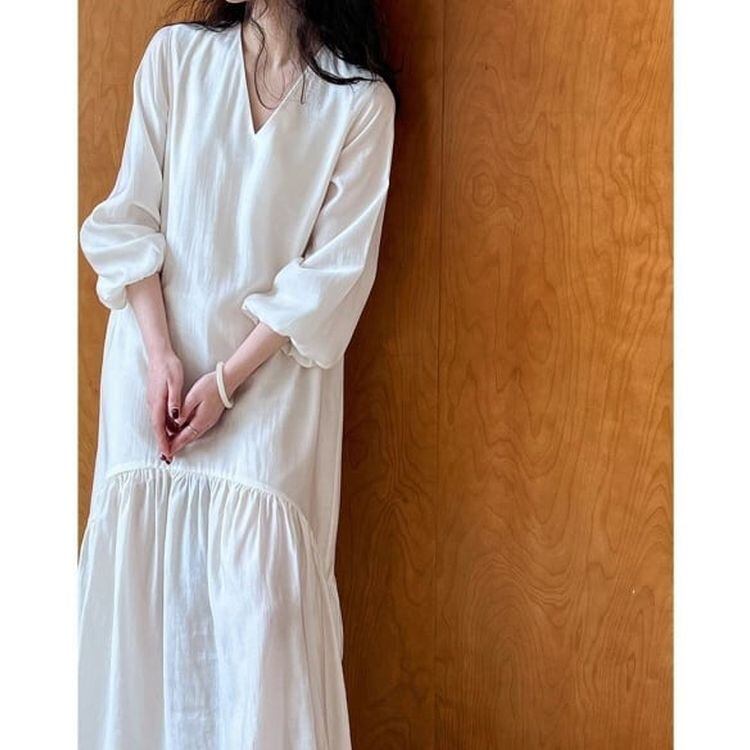 #ホワイトドレス #フィッシュテール #ロングワンピース #プリーツドレス #ノーカラー #ファッション #スタイル #女性ファッション #おしゃれ #春コーデ