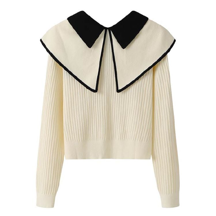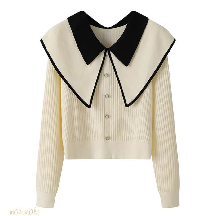 #ホワイトセーター #ブラックカラー #コントラストニット #ダブルラペル #ファッションスタイル