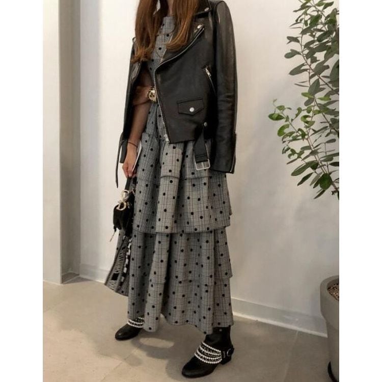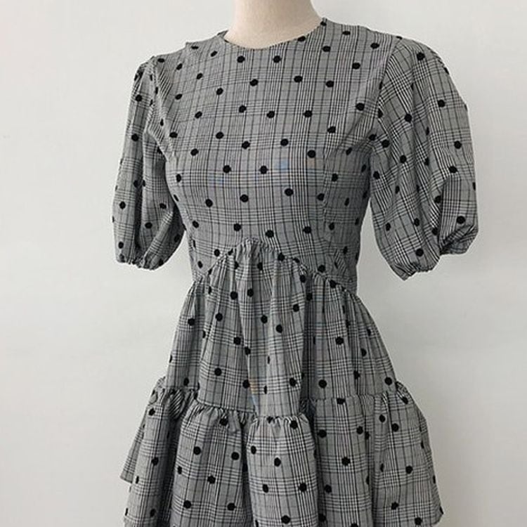 フレッシュで可愛らしい印象を与えるドット&チェック柄のティアードワンピース。