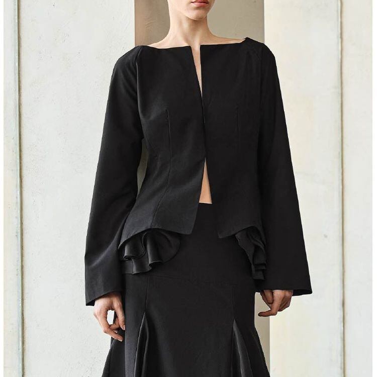 #ブラックブラウス #フリルスリーブ #ペプラムジャケット #ファッションスタイル #トレンドコーデ