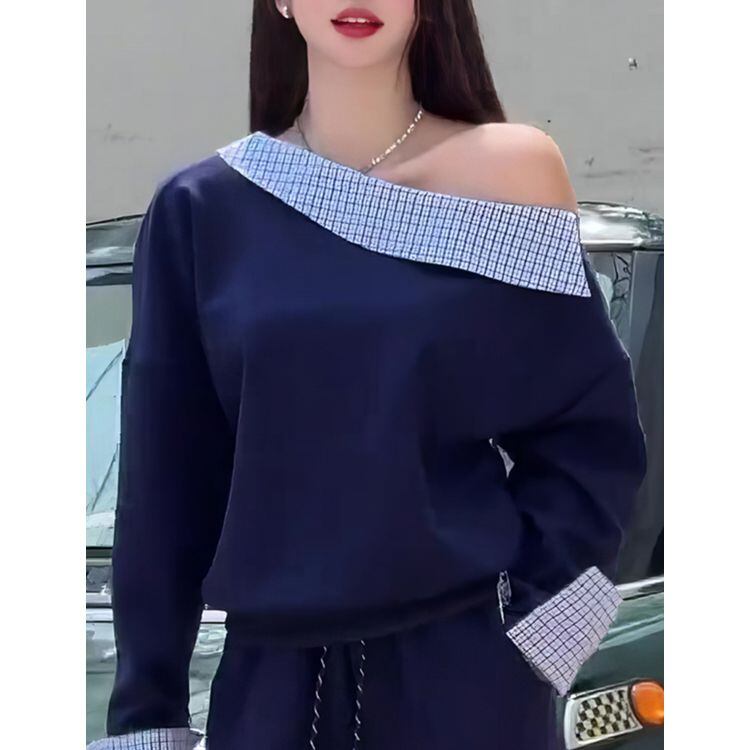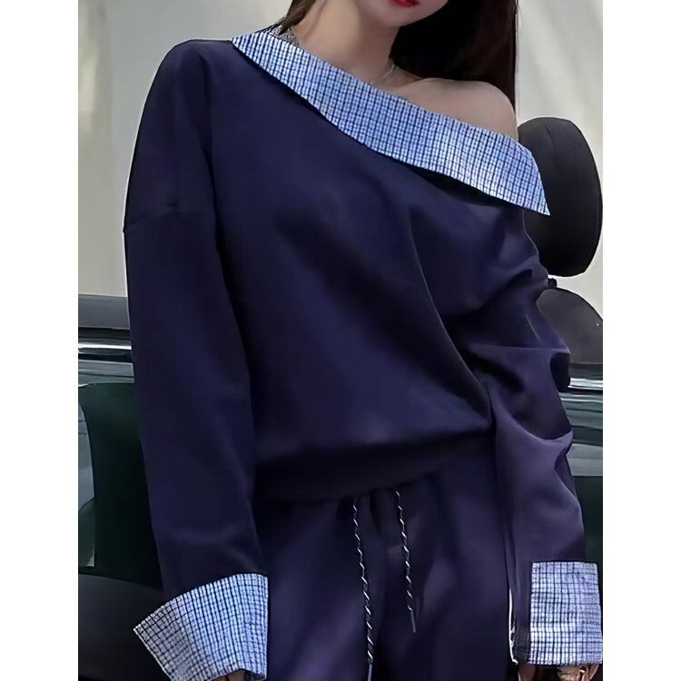 トップスのオフショルダー風デザインと袖口のダブルカフスが、
