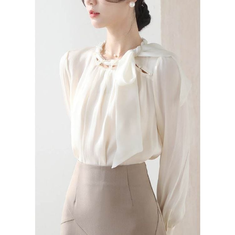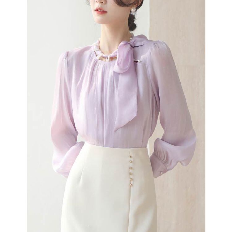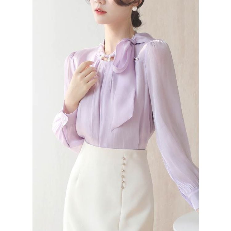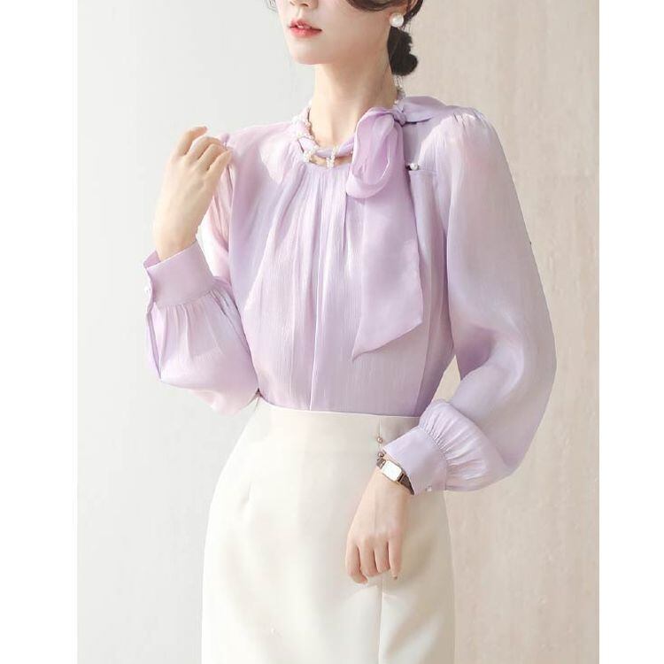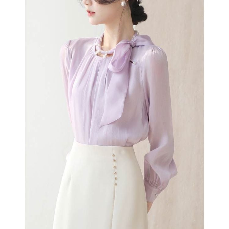 パールネック リボンタイ シフォンブラウス 2color 25069