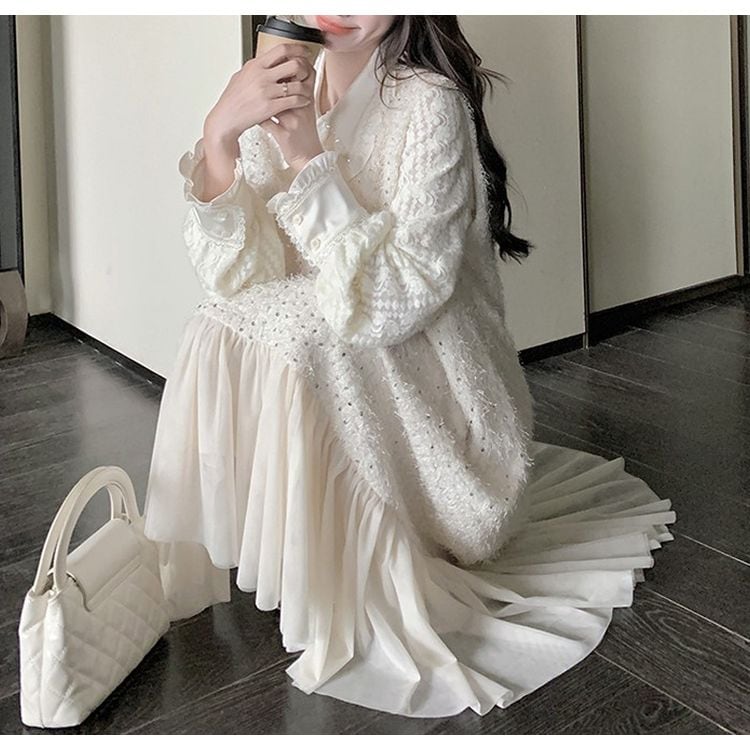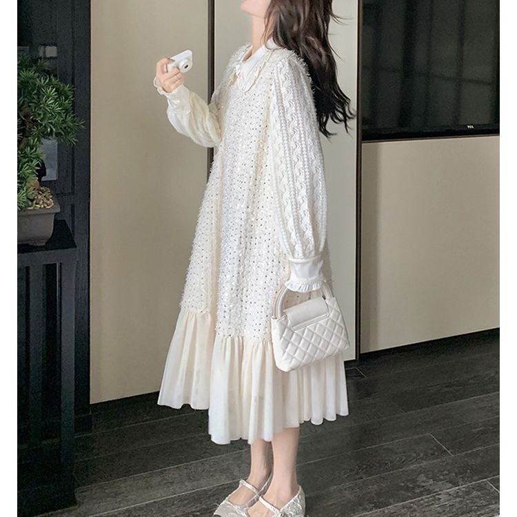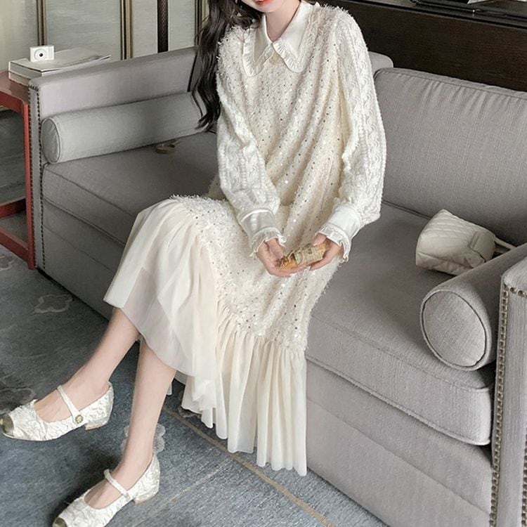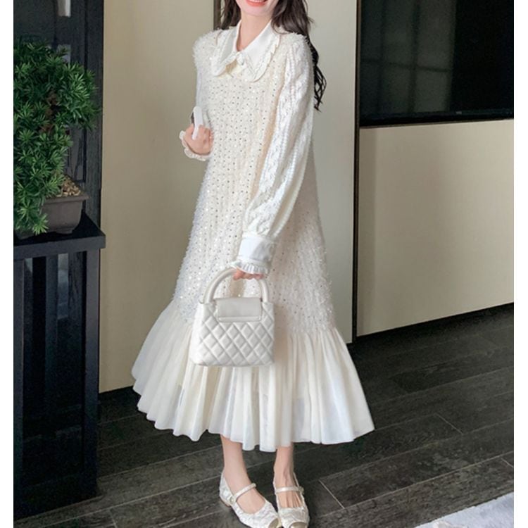 #ホワイトドレス #フラットカラー #レースブラウス #スパンコール #フレアツーピース
