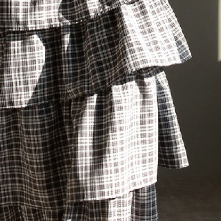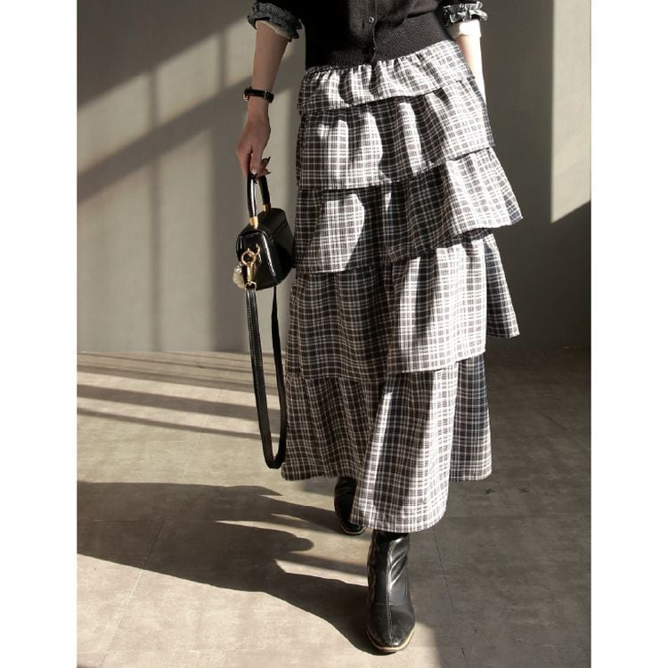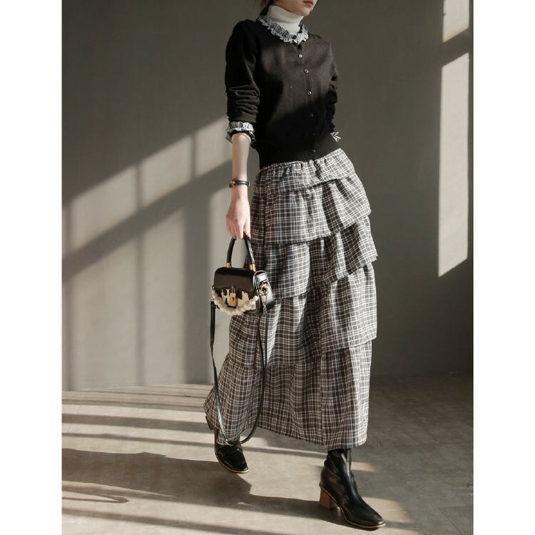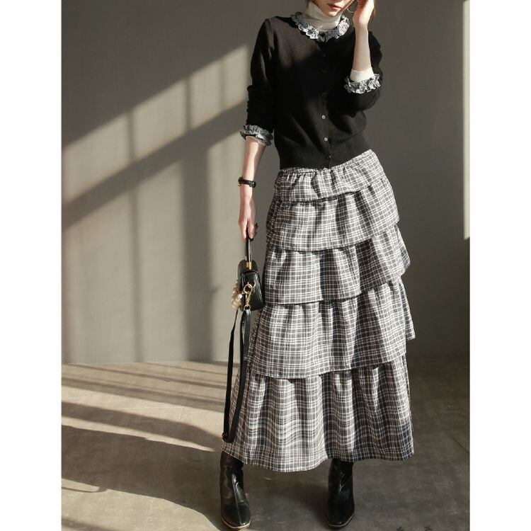 ティアードデザインが女性らしいロングスカートは、落ち着いたチェック柄で大人っぽく着こなせます。